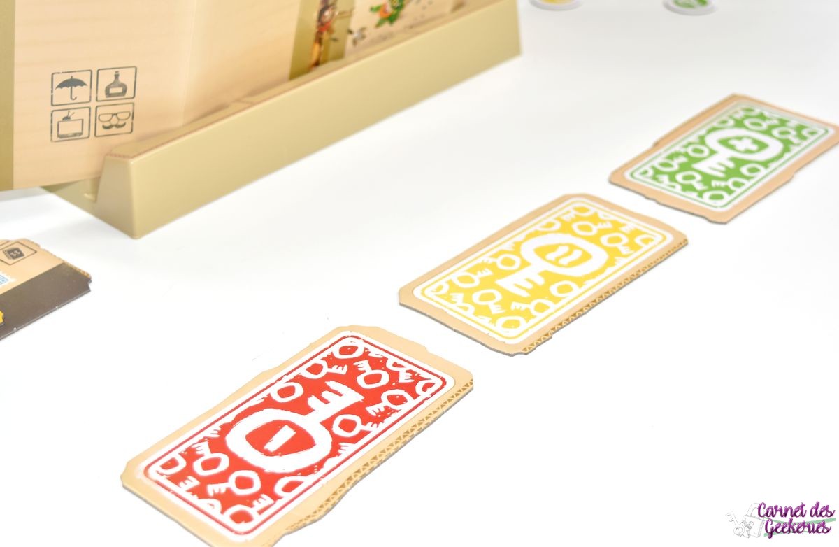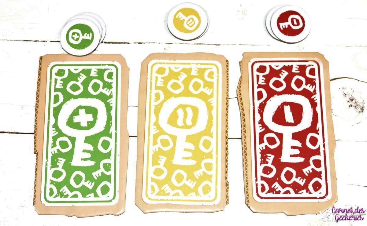 – Action des voyageurs et du meneur : Pendant que le meneur place de nouveau 3 cartes indices, les voyageurs peuvent replacer les cartes dans la zone de tri et tenter d’en déduire des informations sur la clé en fonction des couleurs (verte : lien fort avec la clé, jaune : doutes dessus, et rouge, aucun lien avec la clé ou très faible). A chaque fin de tour, les joueurs vont devoir éliminer une, puis deux, puis trois, et enfin 4 cartes pour qu’il ne reste qu’une seule carte (qui doit être la clé), à la fin de la partie.