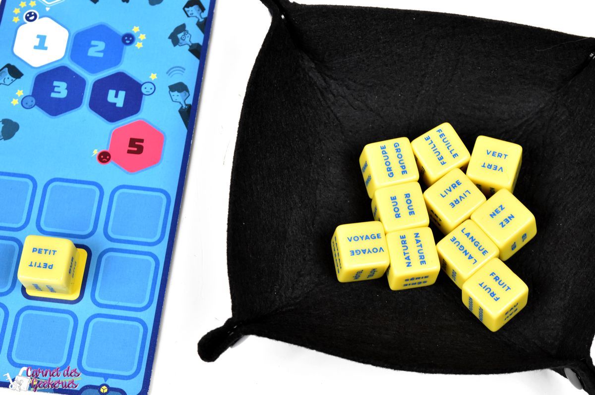 Le premier joueur prendra 10 dés au hasard qu’il lancera dans la piste. Là encore, il va falloir choisir un dé, et le poser sur l’une des 4 cases adjacentes au mot de référence. Comme en compétitif, le joueur notera sa réponse sur le carnet. Les autres joueurs vont alors se concerter et proposer une réponse.