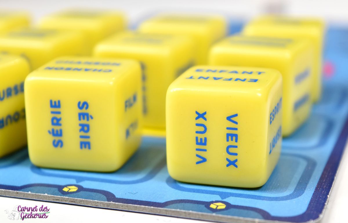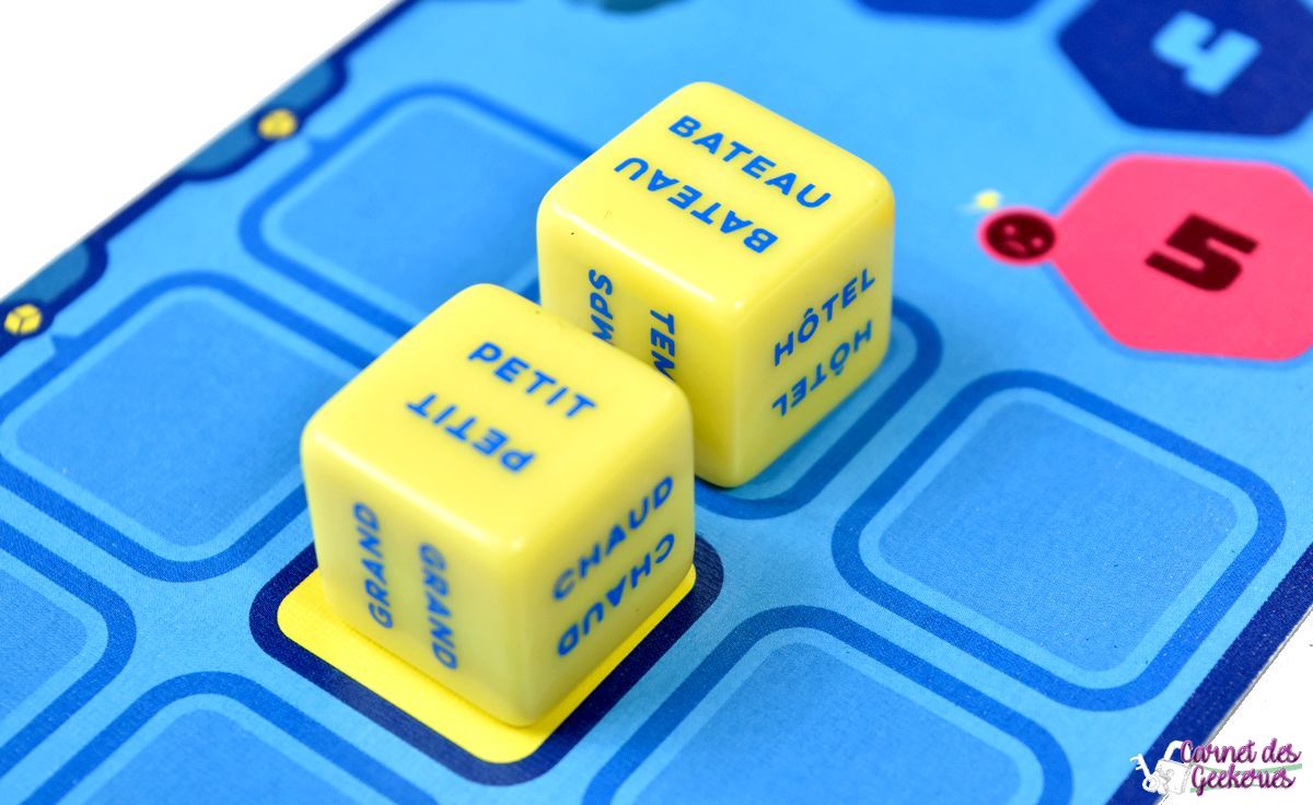 Les tours s’enchaînent ainsi jusqu’à ce que l’une des deux équipes arrive sur la case centrale. Mais ça se mérite ! Il lui faudra trouver une association d’idées avec 5 dés ! Et croyez nous ce n’est pas si évident que ça !