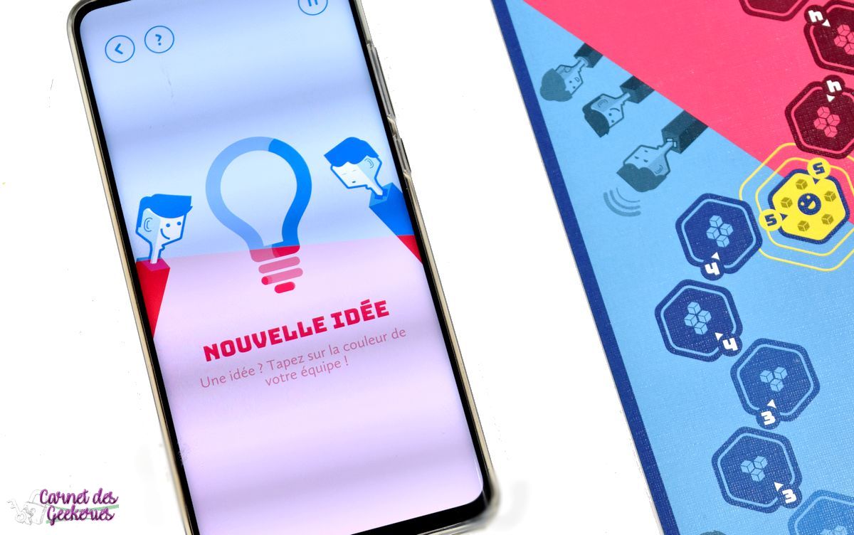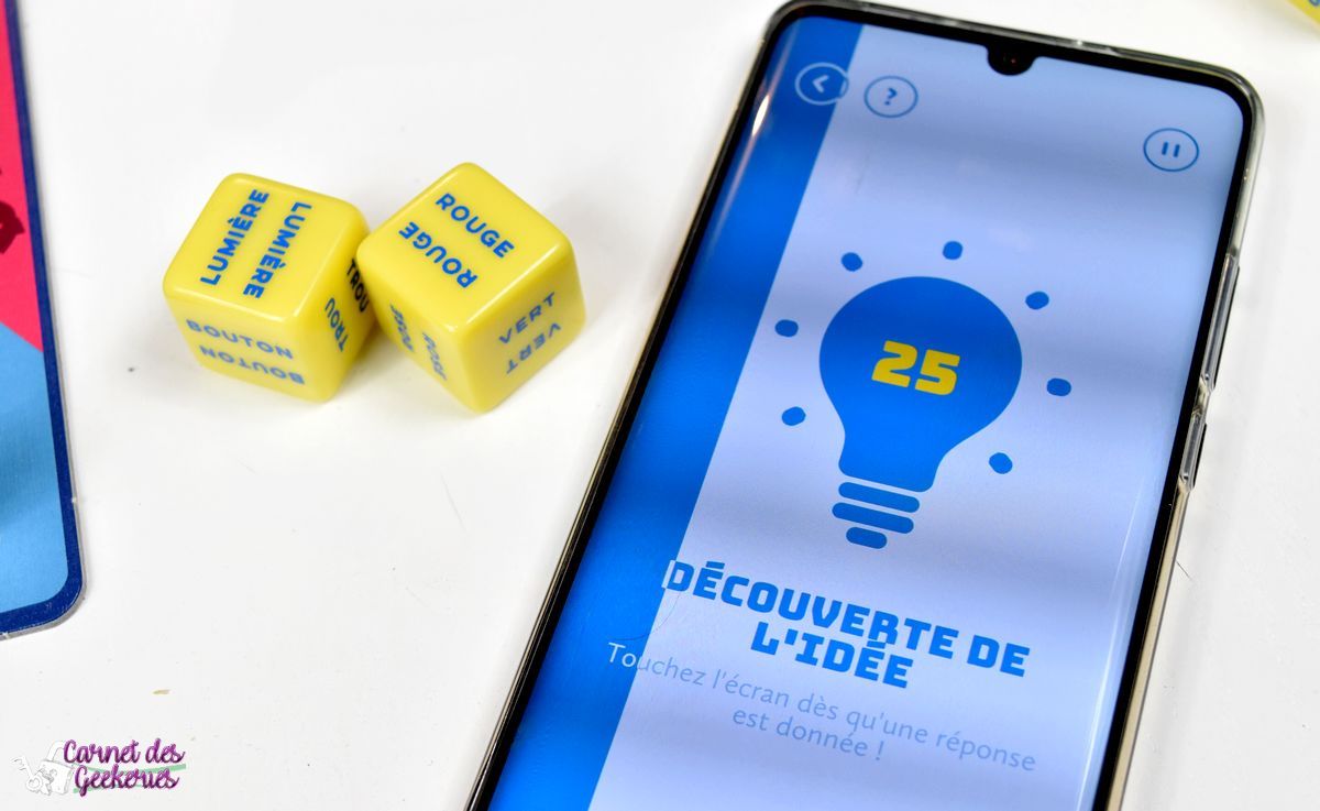 Si l’équipe trouve la bonne réponse, on valide l’idée sur l’application et l’équipe avance son pion. Si ce n’est pas la bonne réponse, on le signalera à l’application et l’équipe adverse aura maintenant 30 secondes pour trouver. S’ils trouvent ils avancent leur pion, sinon l’autre équipe reprendra la main avec un mot indice bonus donné par le joueur à l’origine de l’idée.