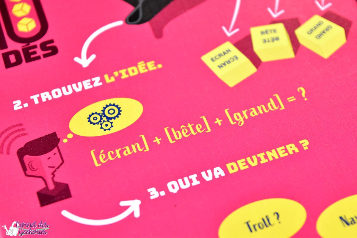 Si les joueurs ont la bonne réponse, l’idée est validée et on passe au tour suivant. Sinon, le pion avancera d’une case, et un indice sera donné par le joueur à l’origine de l’association 10 dés. Si c’est correct aucun soucis on avance, et sinon le dé sera retiré du plateau et le tour terminé.