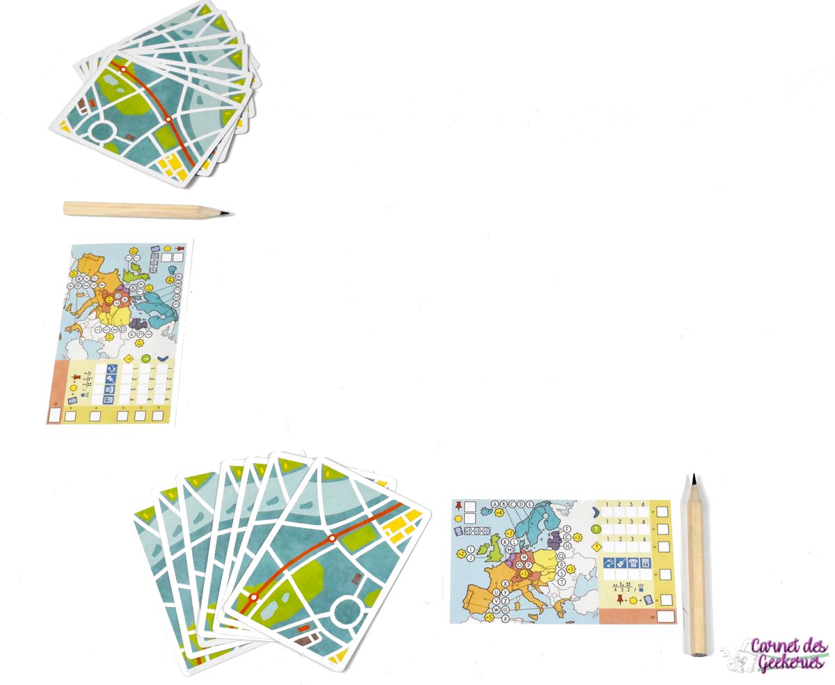 28 cartes – 4 crayons – 1 carnet de score – 2 livrets de règles