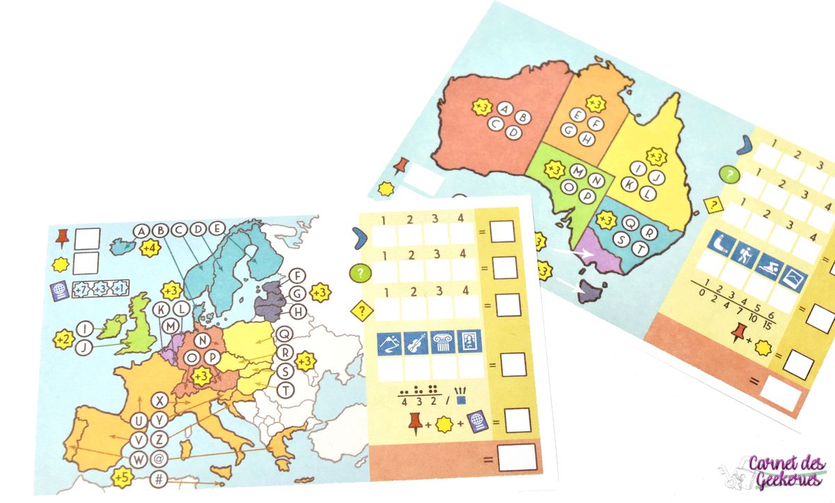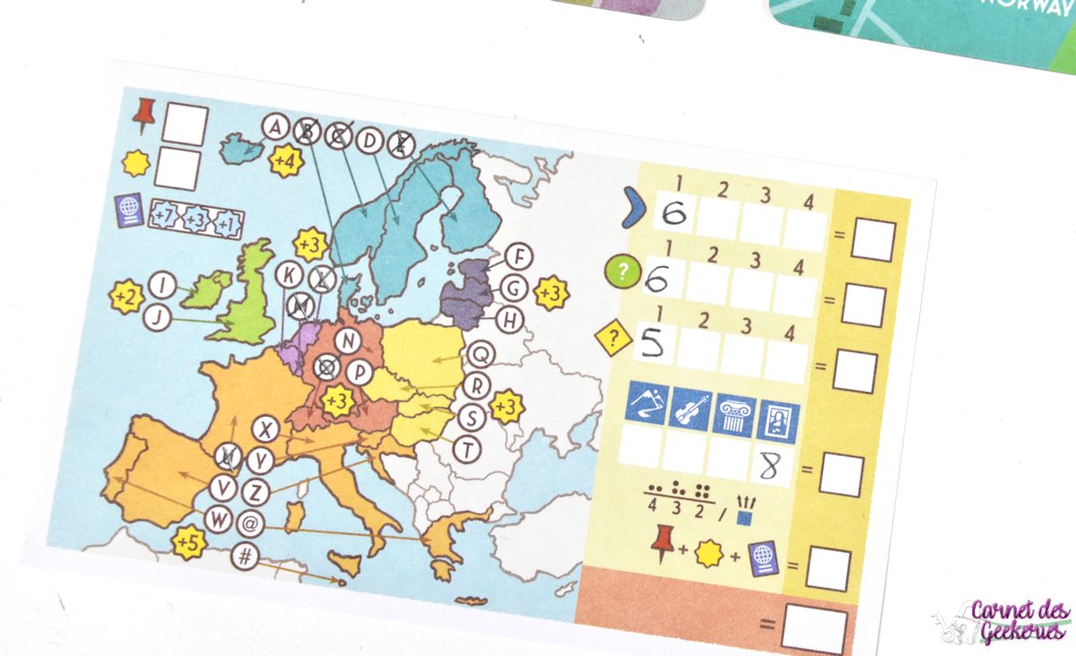 La petite nouveauté vient avec un bonus pour les premiers joueurs qui visitent au moins un pays dans chaque région. Le premier joueur remportera 7 points, le 2ème 3 points, et le 3ème 1 point. Mais ce bonus ne comptera qu’une seule fois même si vous avez deux cases cochées dans chaque région 🙂