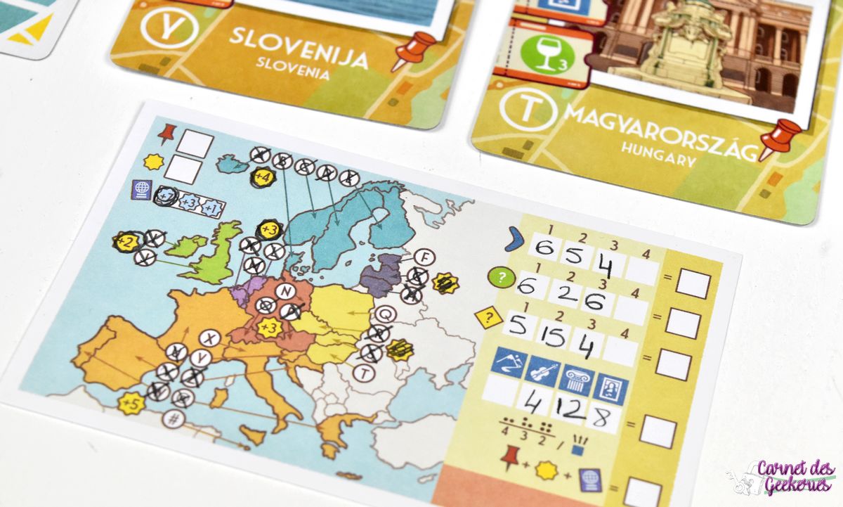 Gastronomie : En Europe, on remportera des points en fonction des spécialités culinaires qu’on aura récoltées. Mais l’indigestion peut vite arriver ! Du coup si le score total est entre 1 et 7, on inscrira son score normalement. Mais si le score dépasse 8, on ne comptera que la moitié des points, arrondis au supérieur.