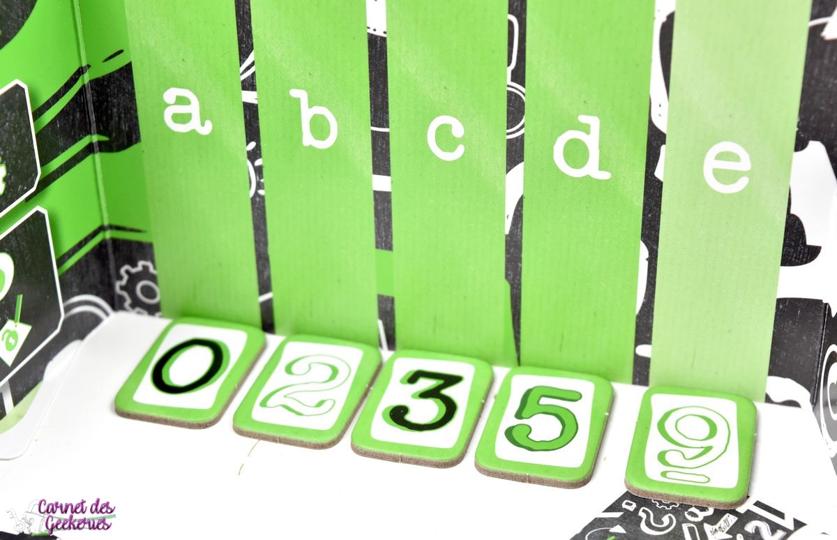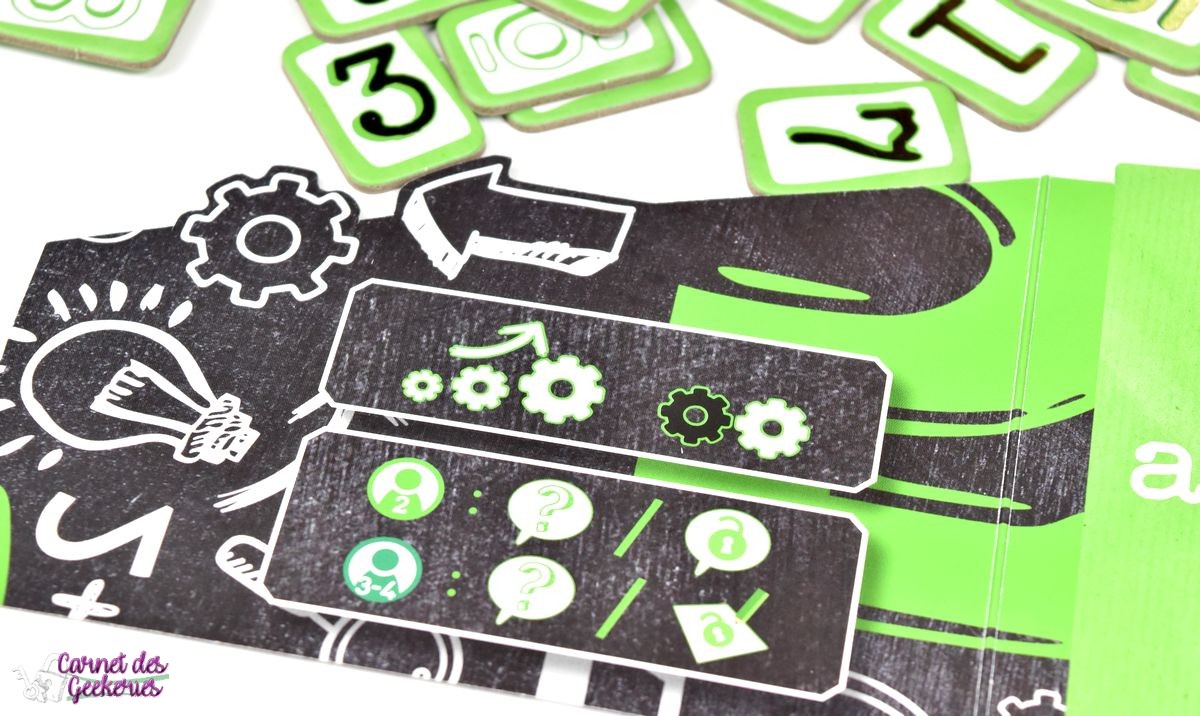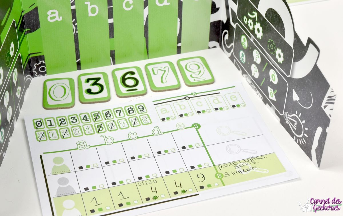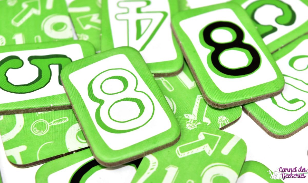 Petit aparté, les paravents permettent de garder secrètes les tuiles. Les questions présentent une question en lien avec la valeur, la couleur, ou la position des tuiles. Les feuilles de notes permettent à chaque joueur de récolter les informations. Les tuiles chiffres contiennent des chiffres entre 0 et 9, présents deux fois (en noir et blanc), sauf le 5 uniquement en vert.