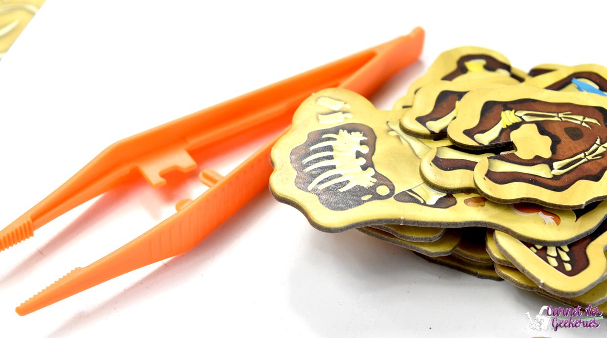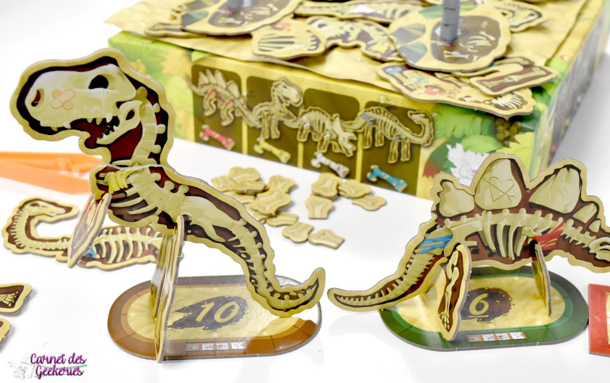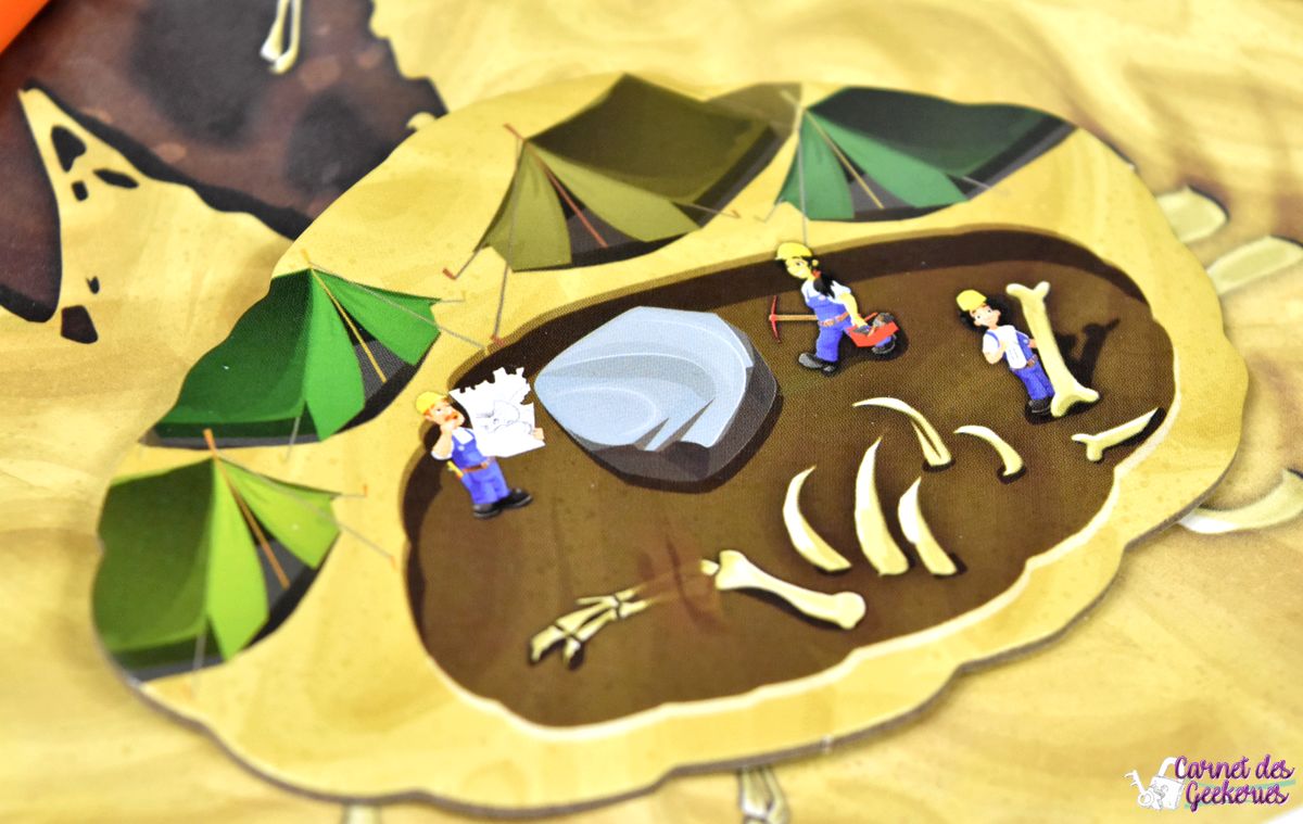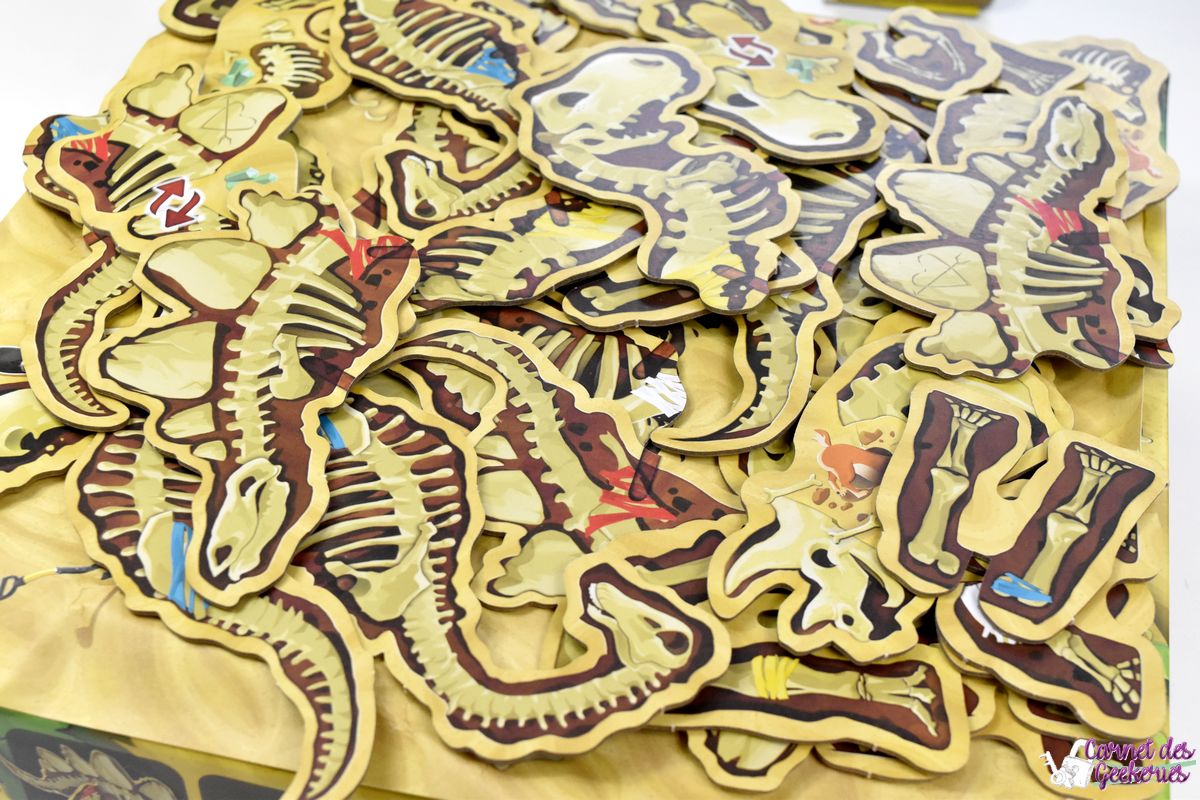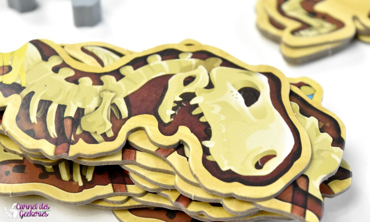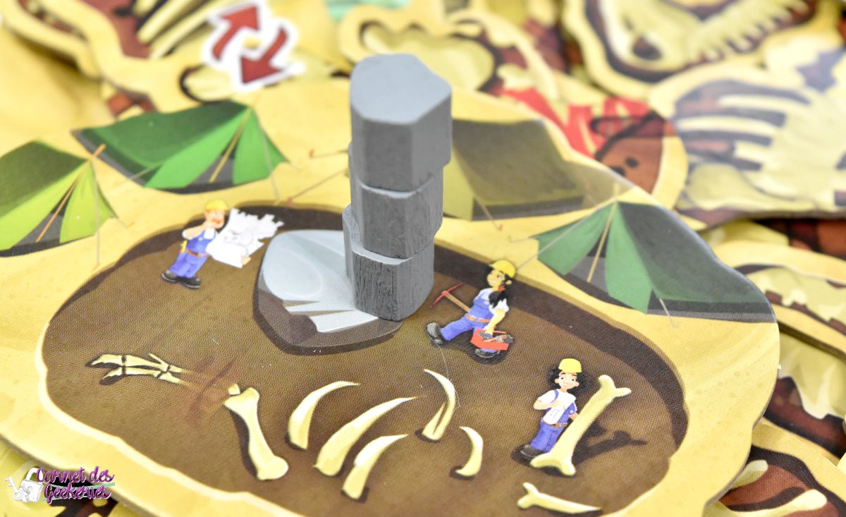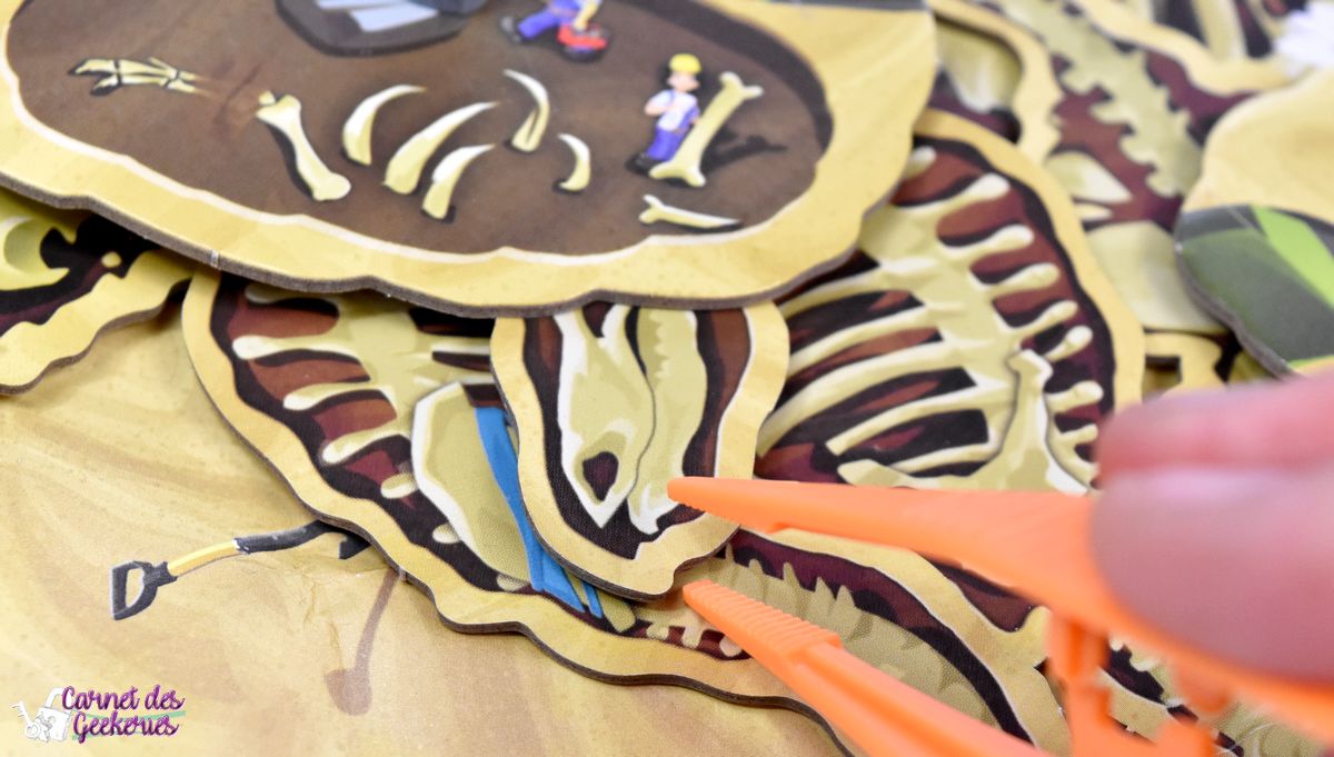 Au début, on ira un peu à tatillons avec cette pince pour extraire les fossiles comme on peut. Et puis, si c’est raté on récupère quand même des points, donc pas de frustration totale vu que les petits os vous rapporteront aussi quelques pv en fin de partie. Bon, par contre, l’intérêt du jeu est de construire les dinosaures hein, pas juste d’accumuler les bouts d’os.