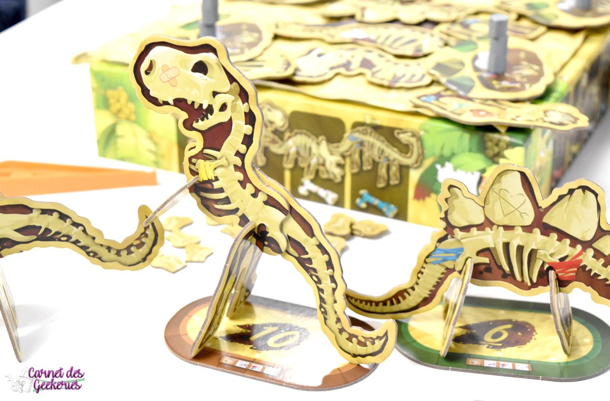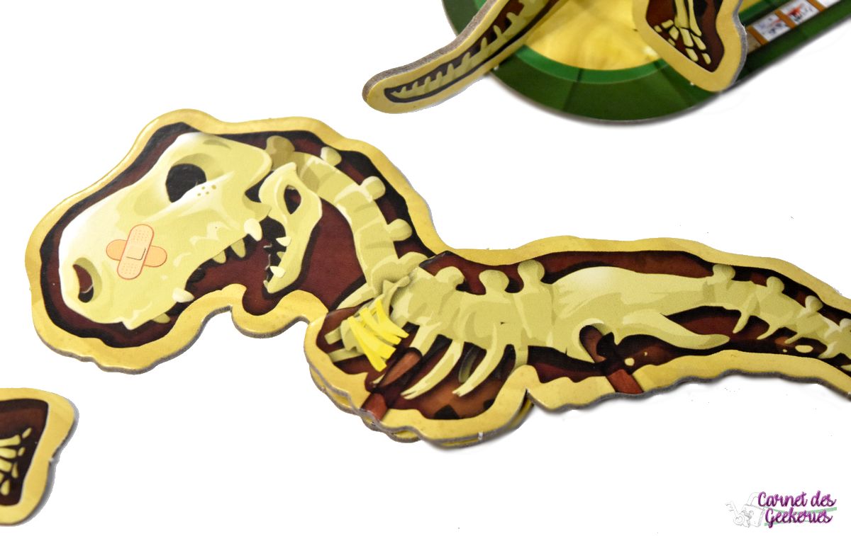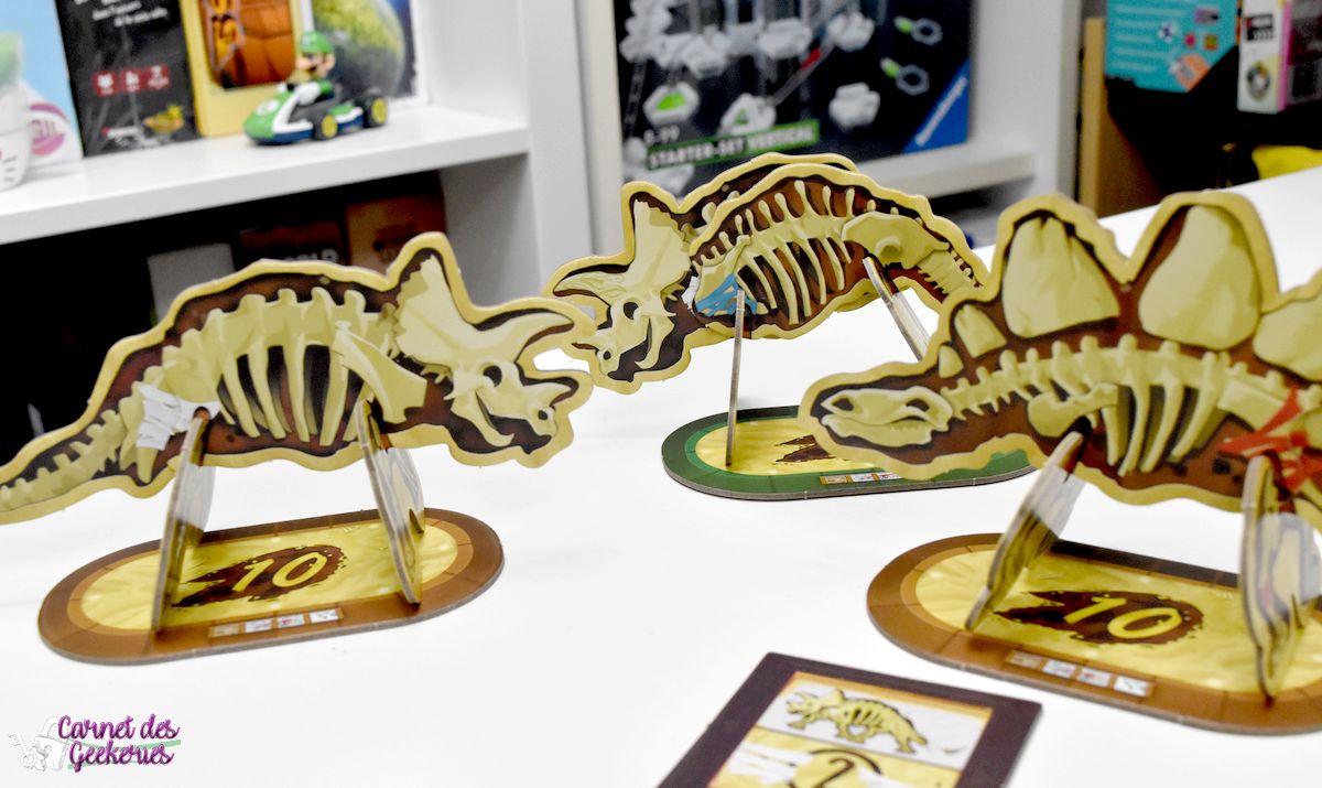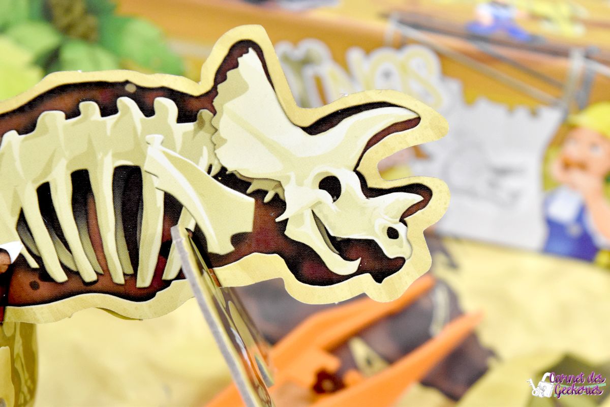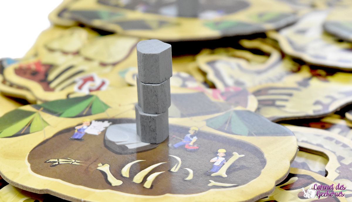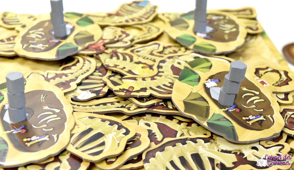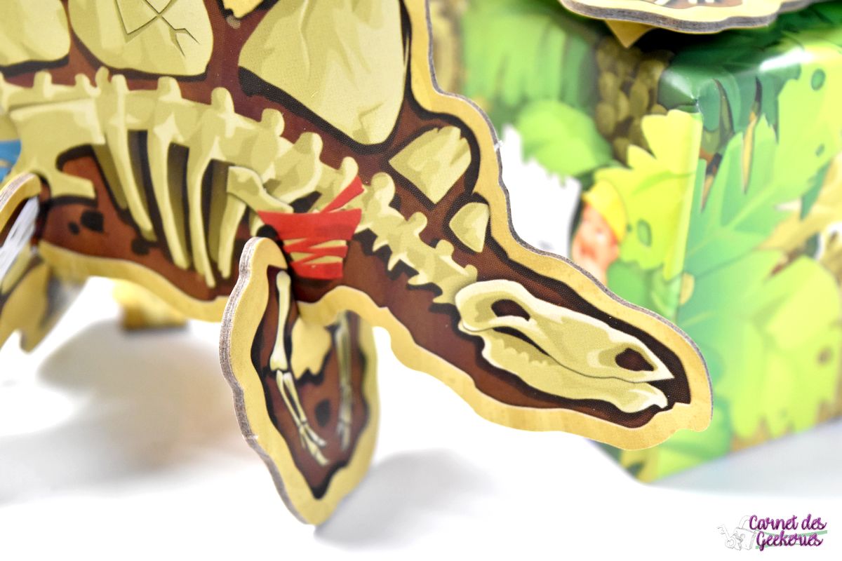 Au début, on ira un peu à tatillons avec cette pince pour extraire les fossiles comme on peut. Et puis, si c’est raté on récupère quand même des points, donc pas de frustration totale vu que les petits os vous rapporteront aussi quelques pv en fin de partie. Bon, par contre, l’intérêt du jeu est de construire les dinosaures hein, pas juste d’accumuler les bouts d’os.