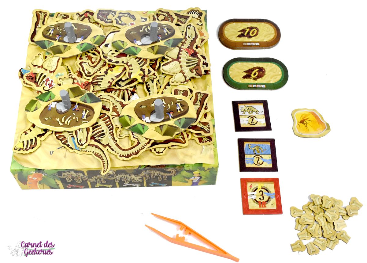 Pour la mise en place, toutes les tuiles seront placées dans le couvercle de la boîte. On froisse le site de fouille qu’on pose sur les tuiles fossiles dans le couvercle. On insère le bas de la boîte à l’envers par dessus tout ça. Plus qu’à retourner la boîte, ôter le couvercle, et votre base de jeu est prête. On ajoutera ensuite les sites d’exposition dessus, avec 3 rochers empilés sur chacun d’entre eux. Les 3 missions seront choisies au hasard et placées à côté de la boîte, tout comme les tuiles expositions. Chaque joueur part avec 2 jetons os et le premier joueur récupère la pince et le jeton ambre.