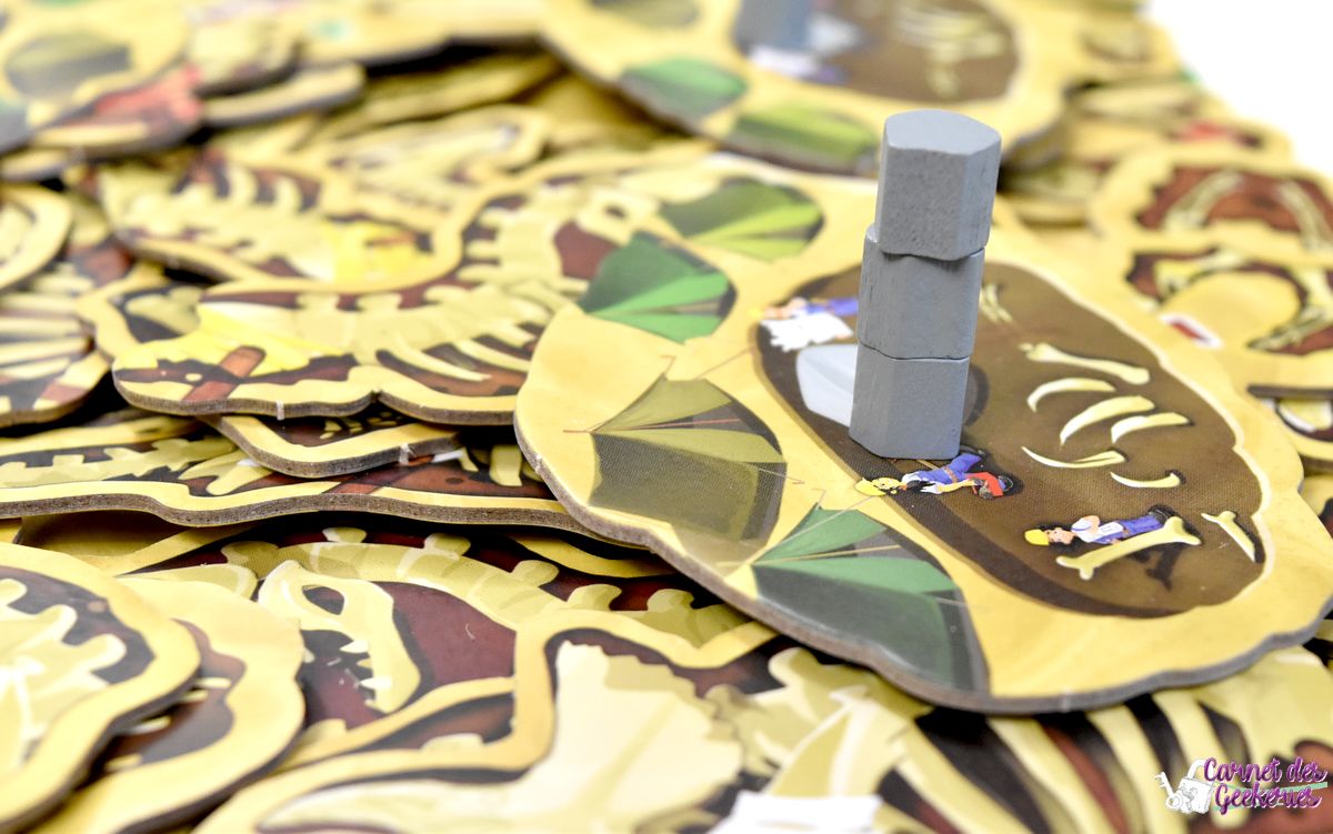 Avec ses tuiles bien épaisses, colorées, le site de fouille à froisser, et le tout à faire tenir sur la boîte, le résultat est très chouette. Et clairement, il donne envie d’y jouer avec un rendu aussi sympa. On s’immerge dans le jeu, comme sur un joli site archéologique.