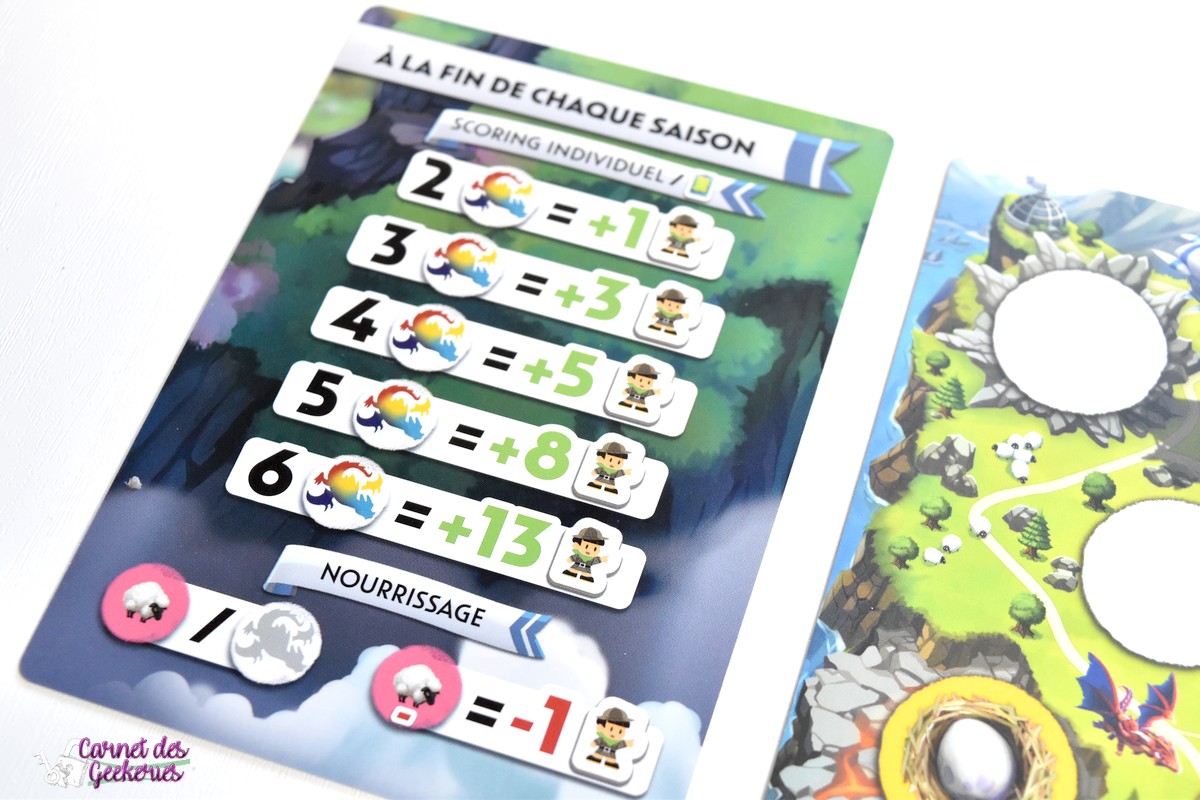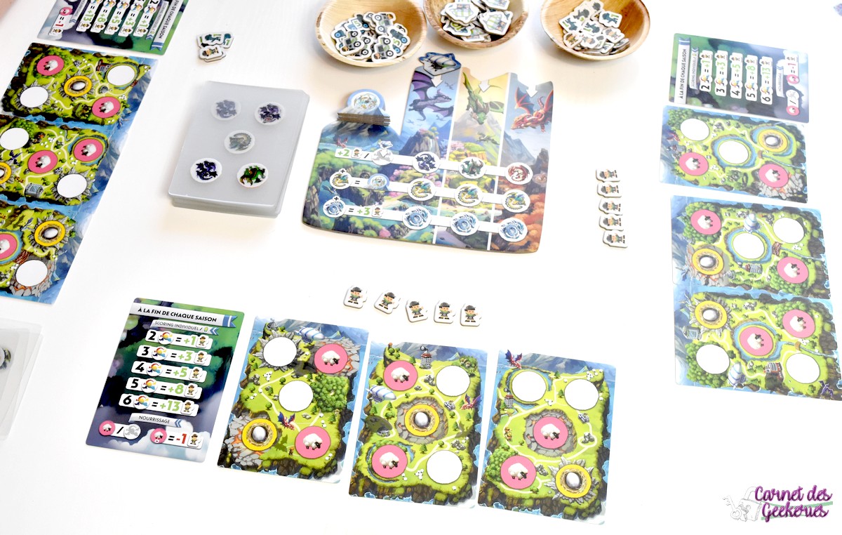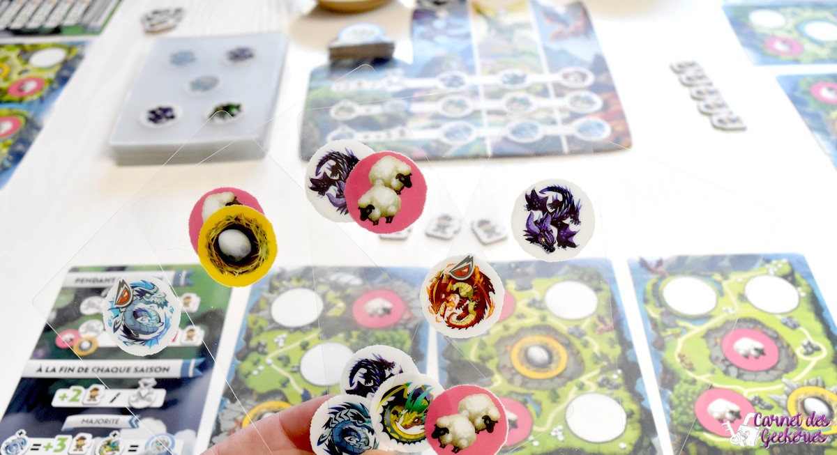 Il faudra ensuite nourrir vos dragons, et pour ça, vous aurez besoin de moutons ! Le nombre de moutons devra être au moins égal au nombre de dragons sinon ils se nourrissent tous seuls, et vous perdez un visiteur pour chaque mouton manquant ! La saison change ensuite, et chaque joueur récupère 4 cartes dragons. A la fin de la 3ème saison, la partie se termine et le joueur ayant le plus de visiteurs dans son parc l’emporte !