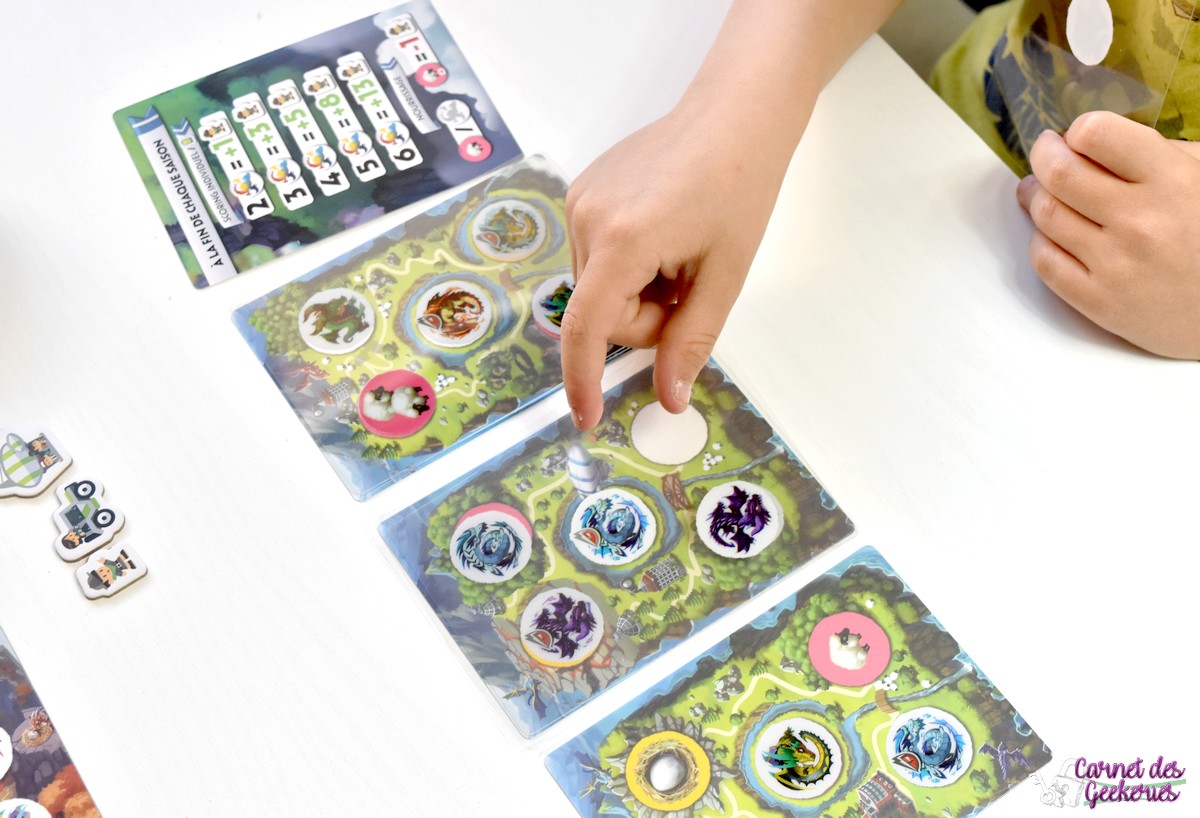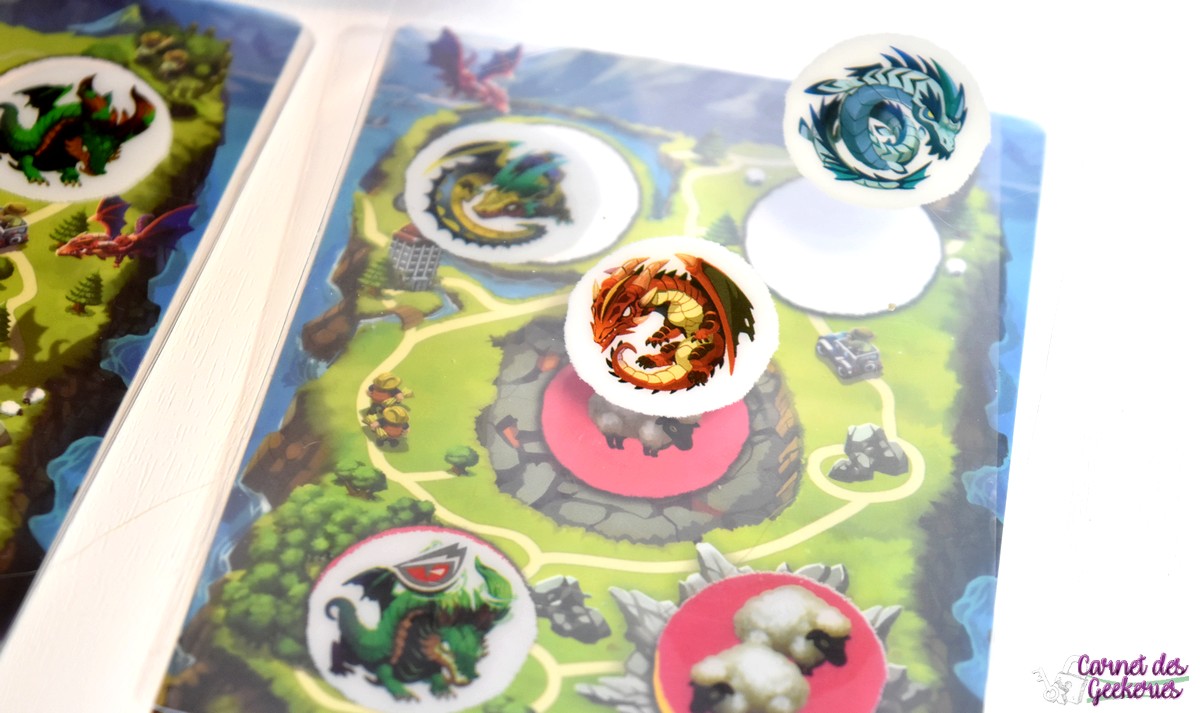 Voilà la base du jeu est là. On va gérer son parc, avec les dragons et un côté superposition grâce aux cartes transparentes. Avec des règles facilement assimilées, et un jeu accessible même aux plus jeunes. Mais derrière ce côté simple, on a quand même une bonne dose de réflexion. Parce qu’il va falloir gérer les oeufs, les dragons furieux, et la variété de dragons, pour tenter de scorer le plus possible sans perdre de visiteurs ! Eh oui, un dragon non nourri ou un dragon furieux qui se fera « virer » du parc se vengera sur les visiteurs. Donc il y a plusieurs choses à gérer, et notamment le nombre de moutons pour pouvoir répondre à leurs besoins alimentaires !