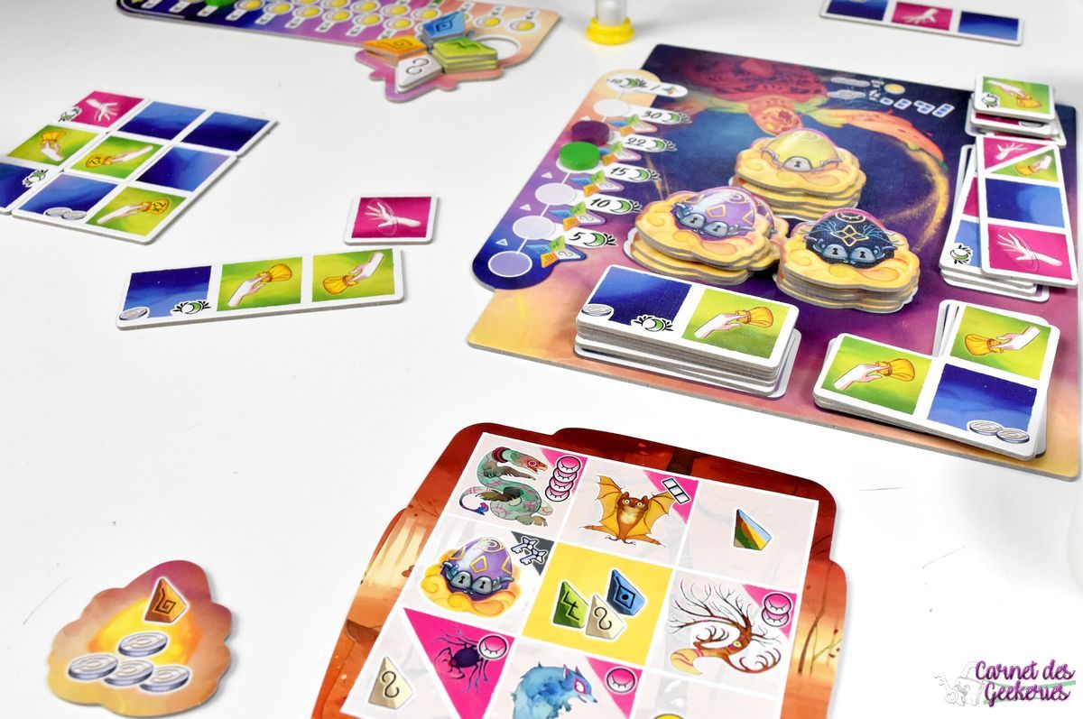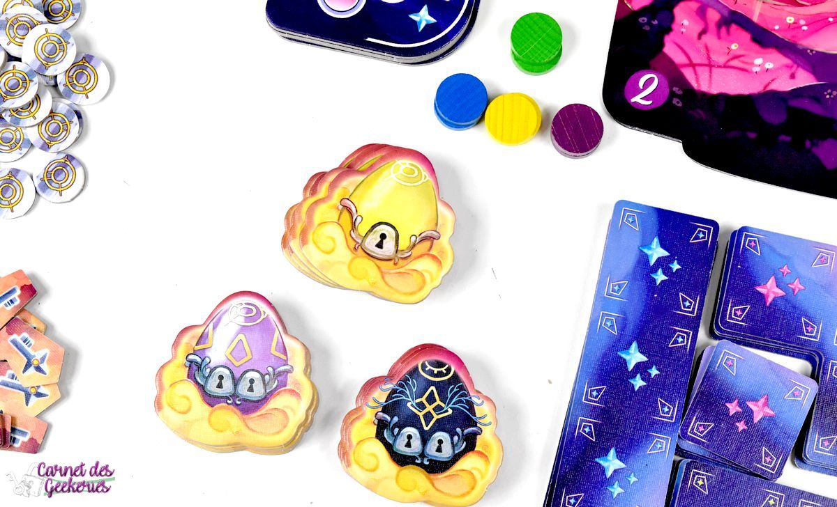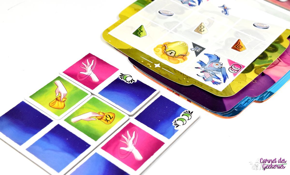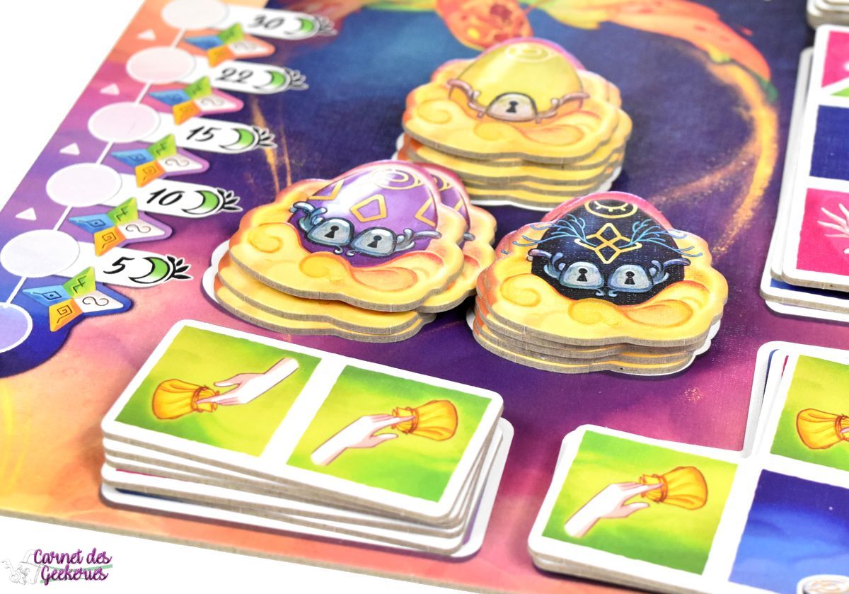 J’avais repéré le matériel à Cannes et forcément le jeu m’avait beaucoup attiré. C’était coloré, plein de matériel, et ça donnait envie. En me renseignant un peu plus dessus, parce qu’à Cannes je n’avais pas pu jouer, l’intérêt était toujours là et je voulais vraiment l’essayer. C’est maintenant chose faite. On se retrouve dans un thème zen, calme, qui nous emmène dans le merveilleux monde des rêves. Mais le jeu aurait pu être tout aussi bon avec un autre thème sans aucun doute. Même si là, ça lui apporte la petite touche magique qui fait la différence.
