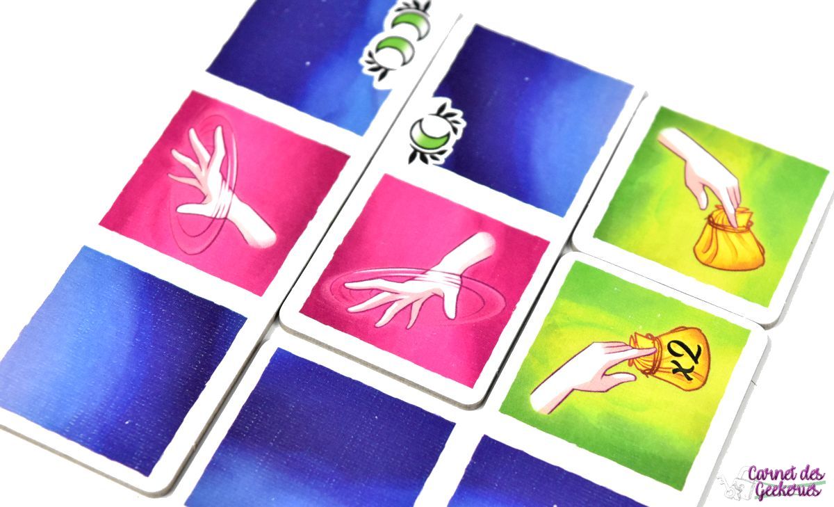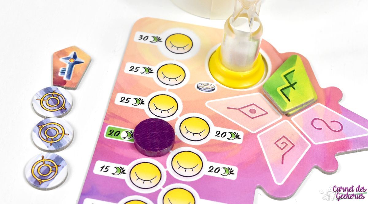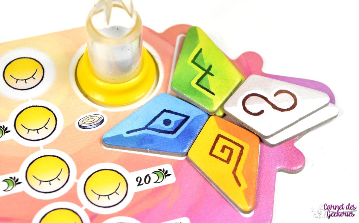 Les joueurs réalisent donc leur parcours tranquillement pour tenter de résoudre un maximum de cases. Dès qu’un joueur est satisfait de ses placements de tuiles, il prend le sablier et le retourne. Il ne pourra plus modifier ses placements, mais récupère une pièce et résoudra son parcours en premier. Les autres joueurs n’ont plus que le temps du sablier pour finir leur composition.