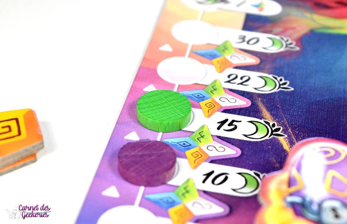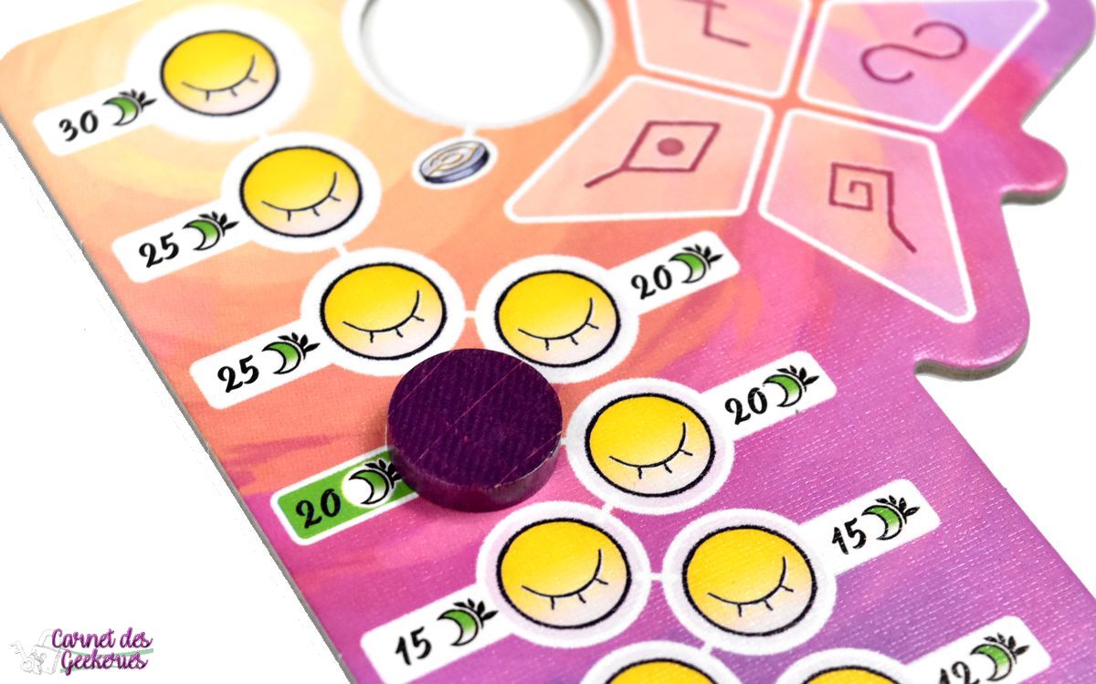 A la fin du tour, les joueurs vont pouvoir améliorer leur stock de tuiles, mais aussi gagner des points grâce aux segments d’étoiles. Les joueurs pourront acquérir des segments en dépensant des pièces, ou gagner des points de sérénité de la même façon. Dès qu’un joueur possède 4 fragments d’étoiles, il pourra également les défausser pour remporter des points. Vous l’aurez compris, il faudra vraiment être attentif à tout.