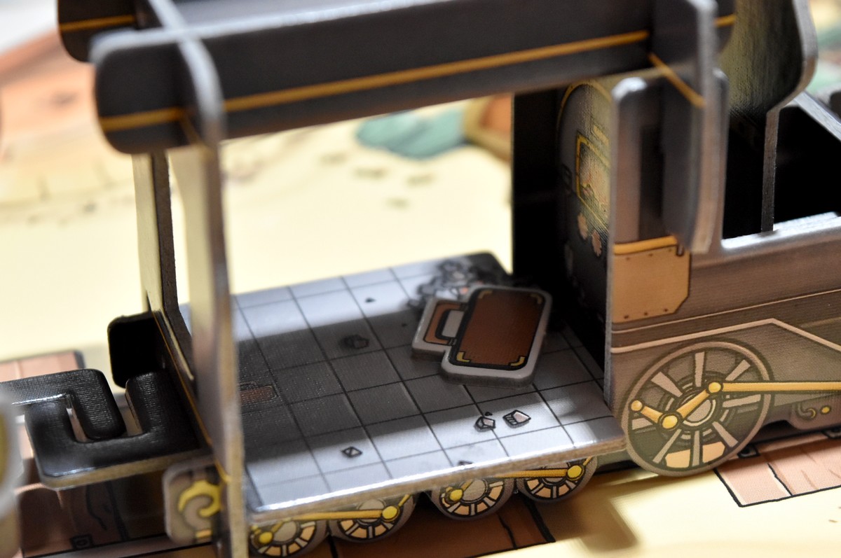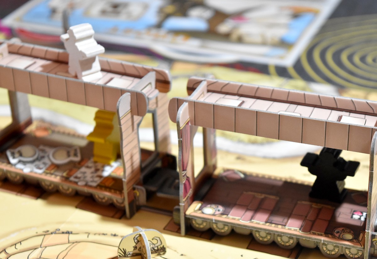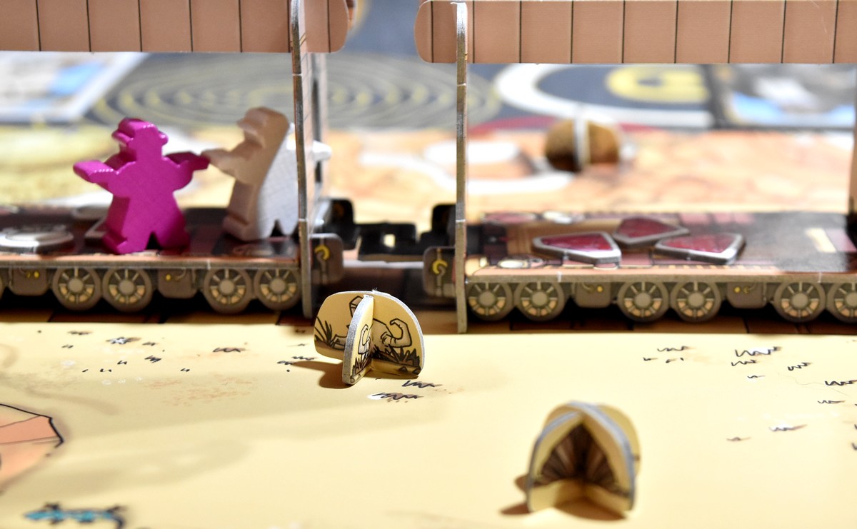 On choisit une arrivée en gare, placée face cachée, et c’est parti ! Les bandits sont placés au hasard en alternant sur le dernier et l’avant dernier wagon.