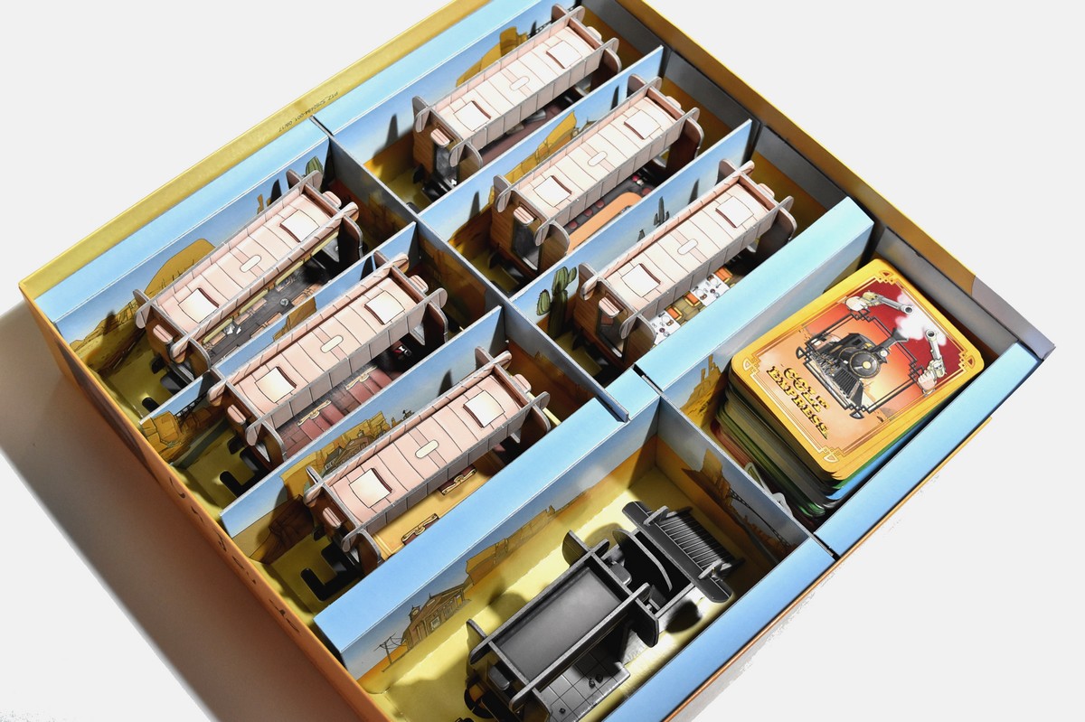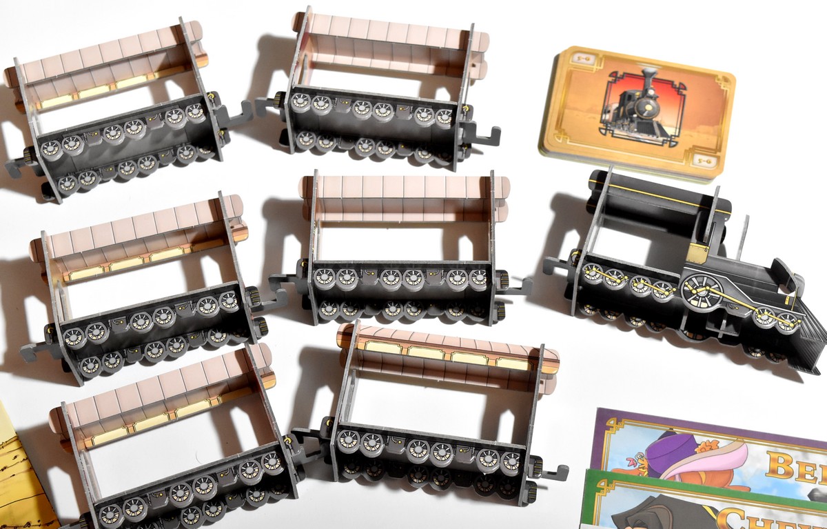 Une fois le train formé avec un nombre de wagons correspondant au nombre de joueurs, on ajoute les différentes bourses & les diamants à l’intérieur des wagons. Le pion Marshal & la cagnotte se situent dans la locomotive. Chaque joueur choisit son personnage et récupère le matériel qui lui correspond. Il prend également une bourse de 250$ et la laisse sur sa fiche, face cachée. Ses 10 cartes actions sont mélangées et forment sa pioche personnelle. Il place également les 6 balles sur le côté gauche de la fiche, dans l’ordre décroissant (la 6 apparaissant sur le dessus du tas).