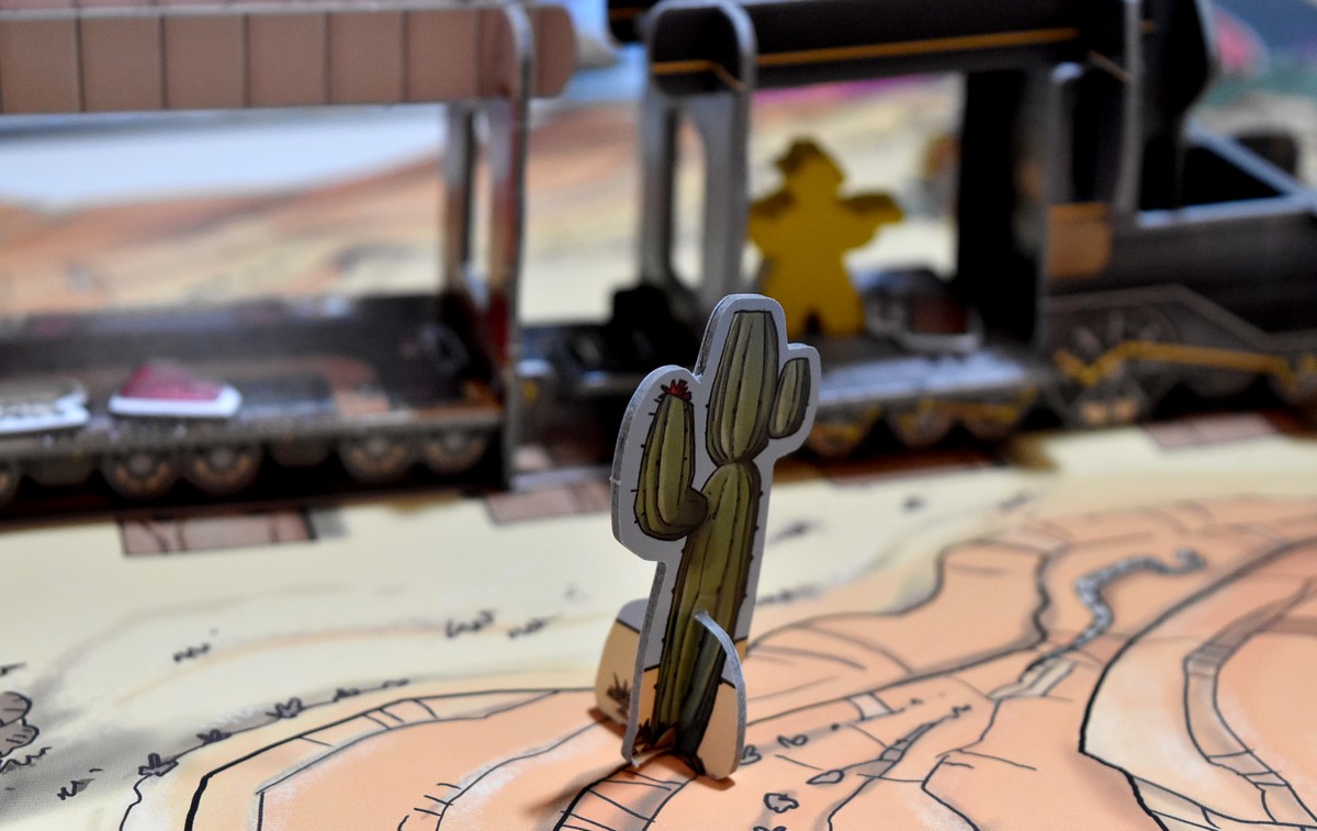 Déjà, le thème est plaisant, mais en plus son matériel est juste canon ! On joue réellement avec un train en 3D ! Et dans la version que j’ai, il y a même le tapis poster et les décors, histoire de plonger encore plus dans l’ambiance Far West ! Oui le petit train fait son effet hein 😉 Mais le jeu est magnifique, et rien que son matériel donne envie de jouer tout de suite ! Attention cependant pour le montage, il est relativement fragile, enfin surtout les pièces en 3D qui peuvent se déchirer si vous y aller trop vite !