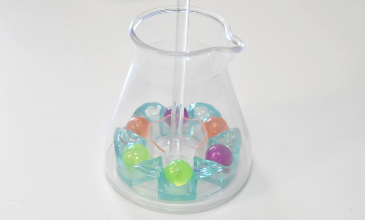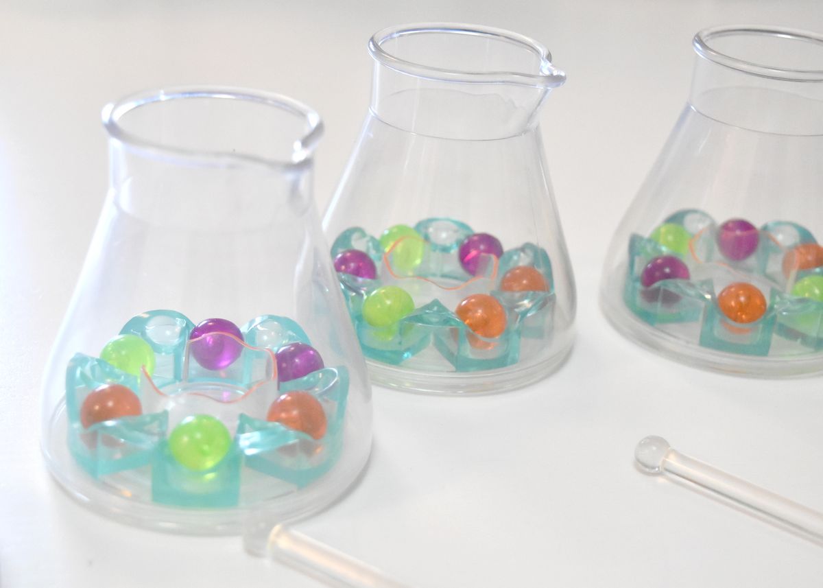Chaque joueur récupère 1 fiole, 1 bâtonnet, et 6 molécules (2 de chaque couleur). Il les place dans la fiole & la secoue de façon à ce que toutes les molécules soient correctement placées dans les compartiments. La plateforme tourne, et de ce fait il y a 8 emplacements disponibles.