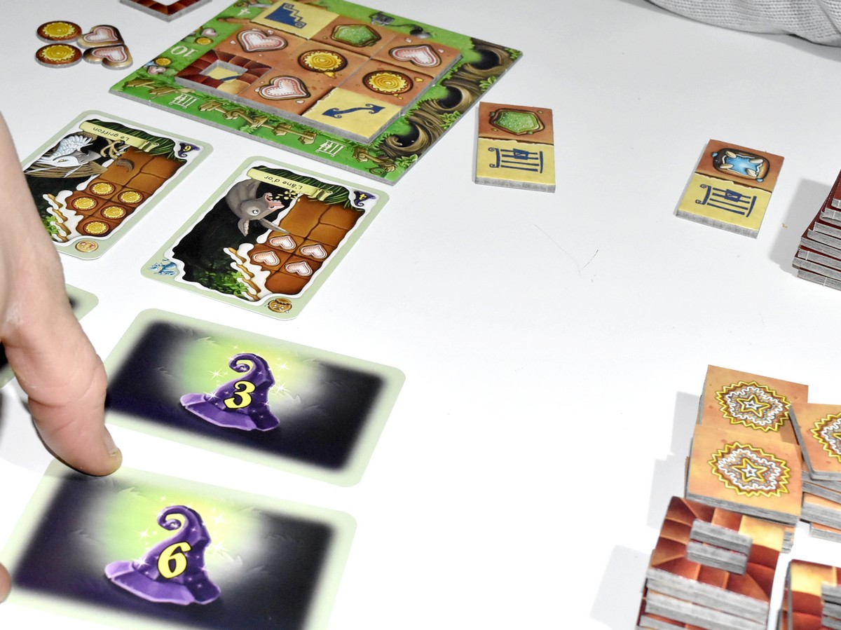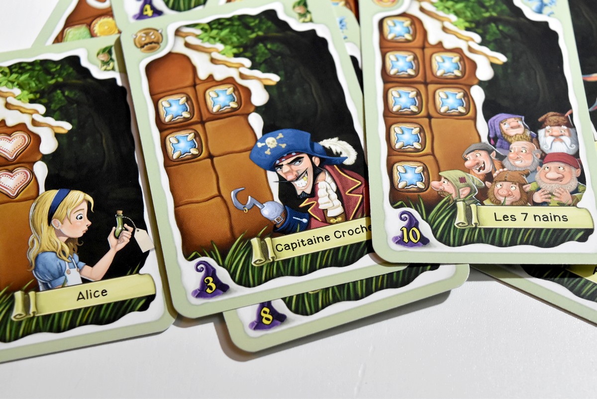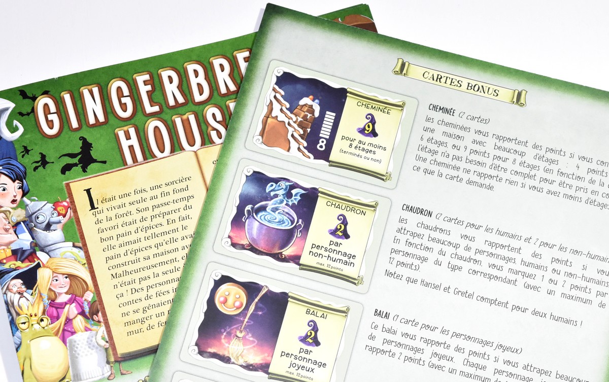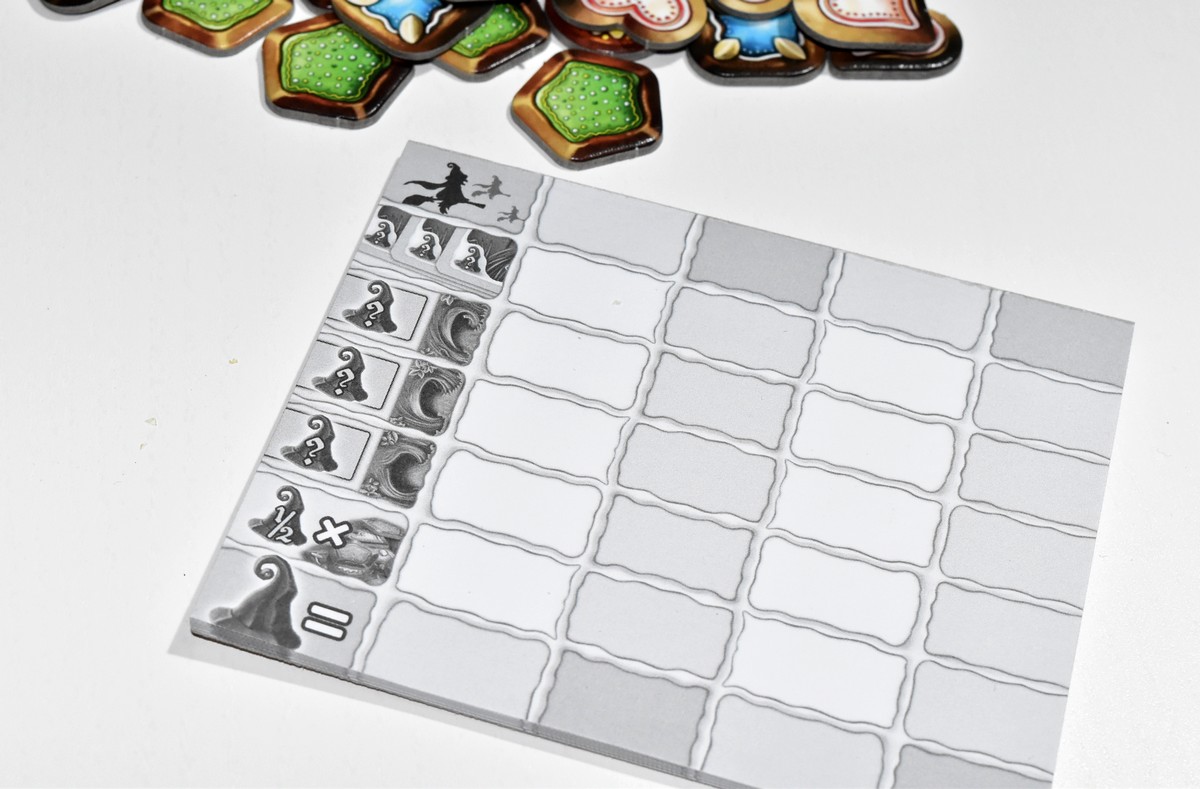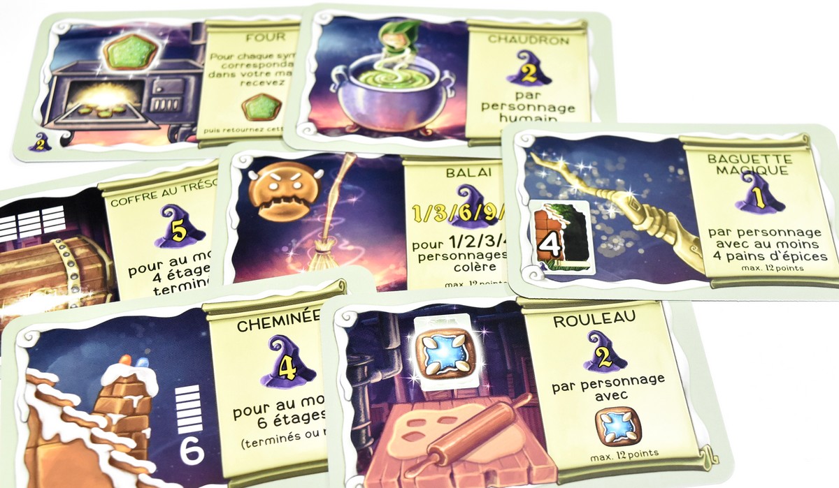 La partie se termine lorsque les sorcières n’ont plus de tuiles double face. A l’aide du bloc de score, on va compter les points de victoire : les personnages attrapés en fonction des points indiqués dessus, les cartes bonus rapportent les points indiqués ou selon les spécificités de chacune, et la moitié des jetons pains d’épices est également à rajouter. Celle qui a le plus de points à la fin de la partie, la remporte 😉
