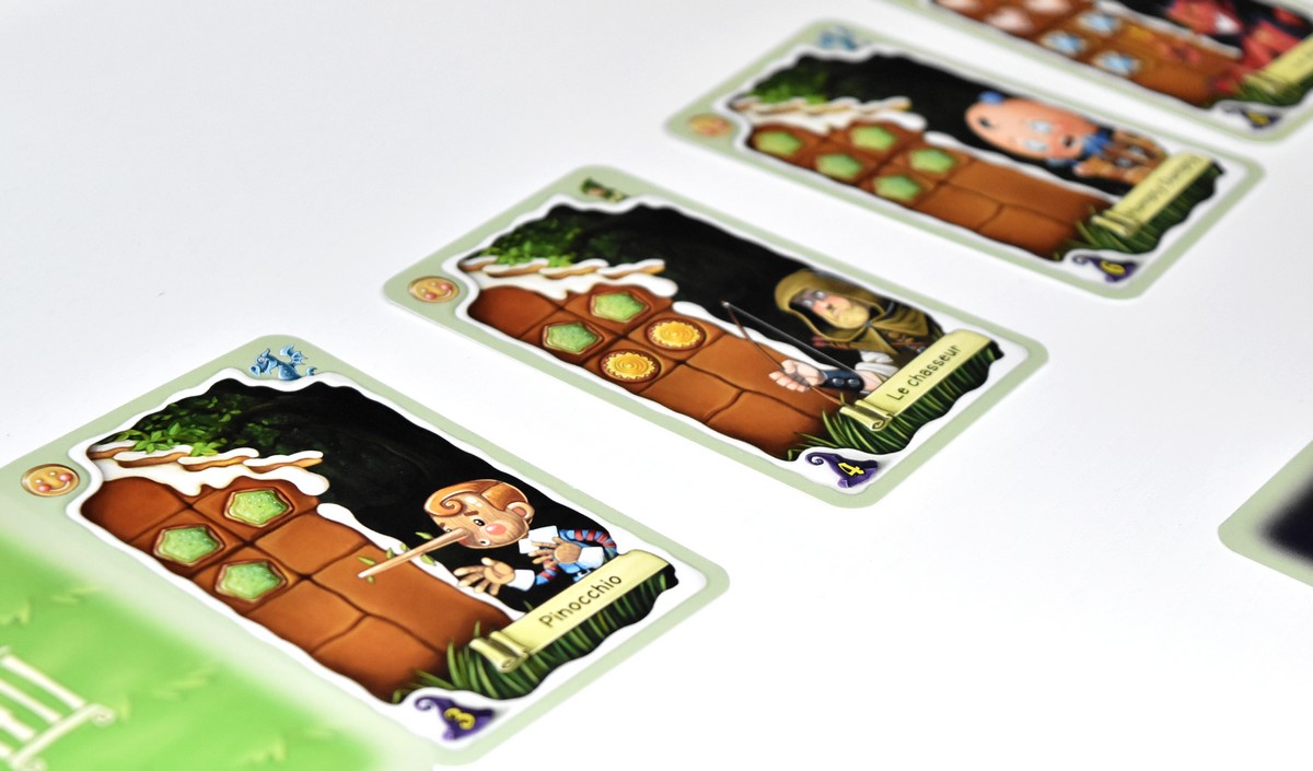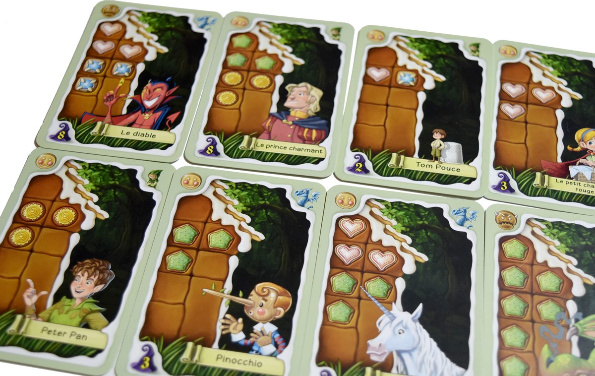 Autant vous le dire tout de suite, côté illustrations il y a un boulot de dingue, et le rendu est vraiment magnifique ! Il y a donc 40 personnages différents allant de Pinocchio à une licorne, voir même un diableet on aurait presque envie de tous les accueillir chez nous ! Mais pour ça, il faut produire du bon pain d’épices sur les murs de notre maison ! Le matériel est de bonne qualité, et les tuiles assez épaisses pour repérer tout de suite où on en est sur la construction d’étages … plus pratique pour les cartes bonus quand même !