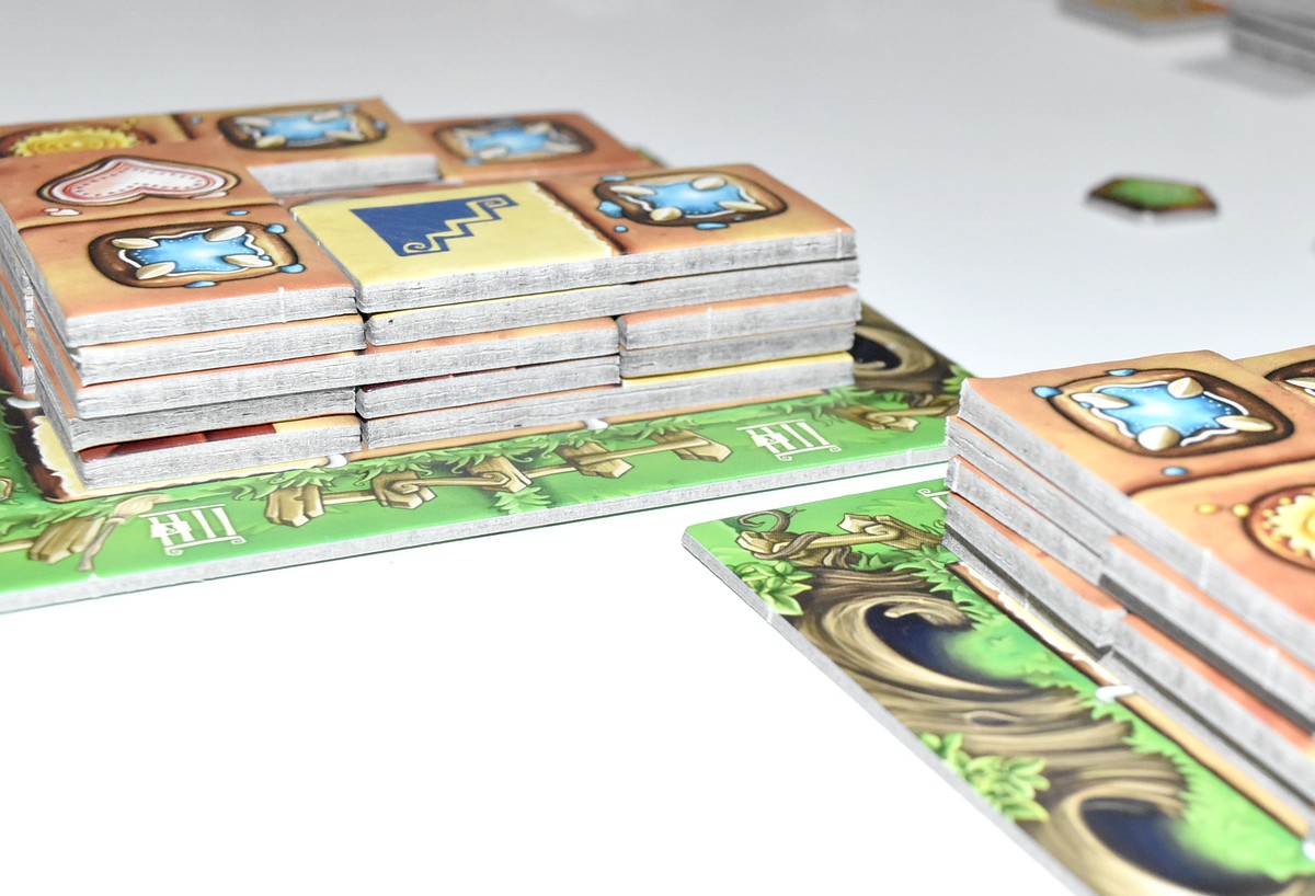 Lorsqu’une tuile double recouvre deux symboles identiques à la sienne, l’effet peut être appliqué 3 fois au lieu de deux … l’effet magique du jeu !