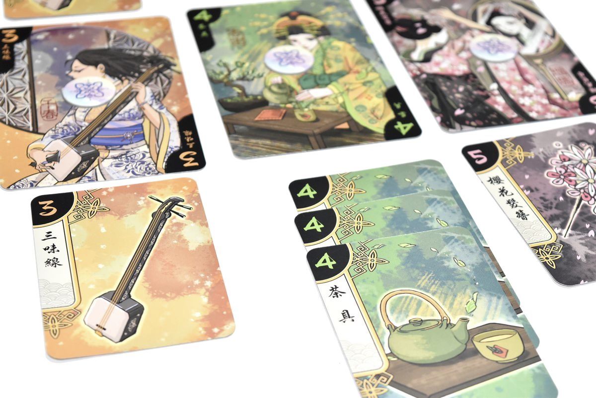 - Offre : 3 cartes objets de la main du joueur sont placées face visible devant soi. L’adversaire choisit une carte qu’il place de son côté devant la Geisha correspondante. Les deux autres sont placées côté joueur actif devant les Geishas également.