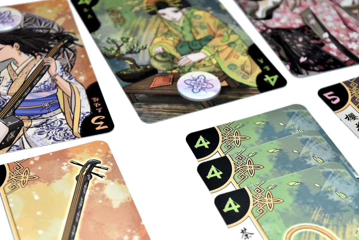 Par contre, avant de préparer une nouvelle manche, on vérifie si l’une des conditions ne serait pas remplie : si un joueur a 4 Geishas dans son salon de thé, ou 11 points Arts (marqués en haut à gauche des Geishas), la partie s’arrête immédiatement.