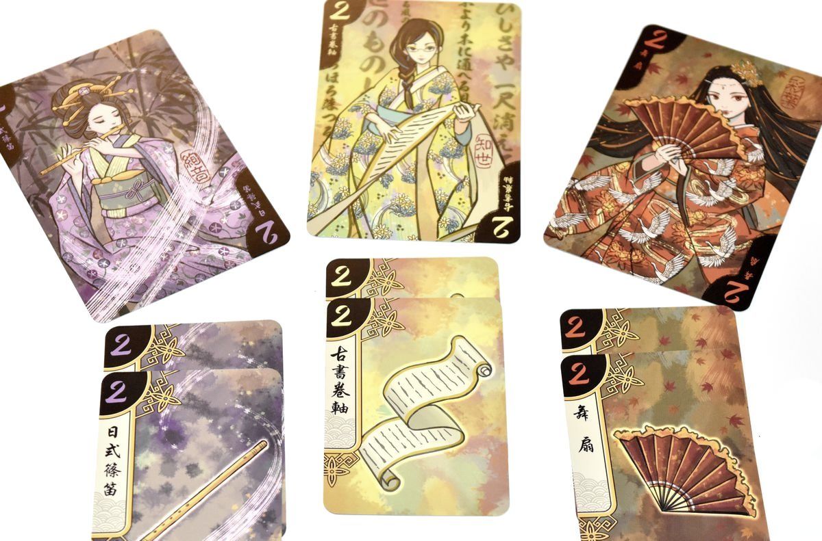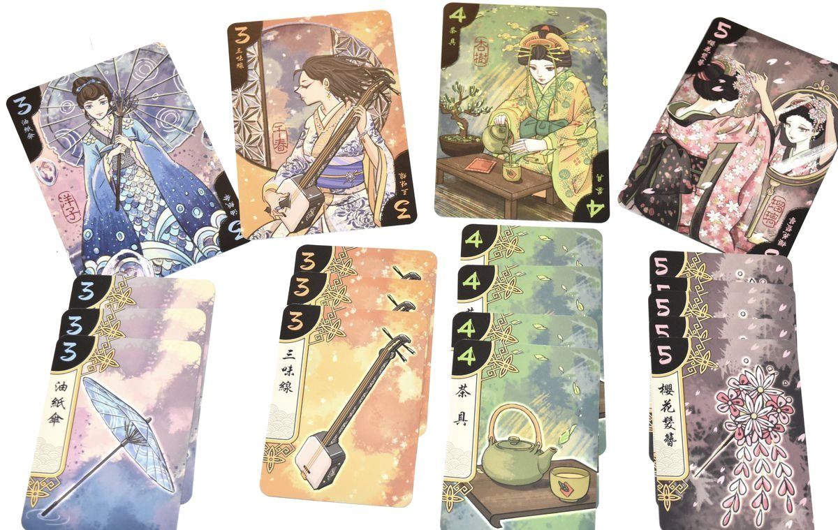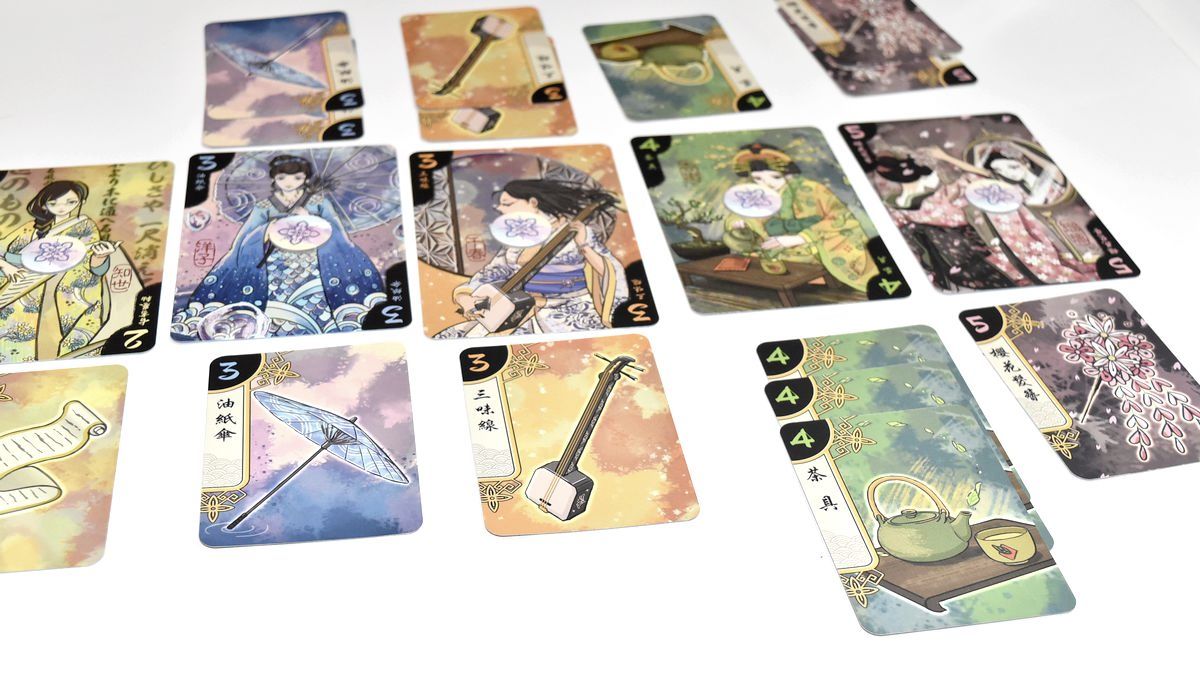 Chacune des cartes objets correspond à une couleur d’une Geisha. Pour la mise en place, les joueurs se placent en face à face, et disposent les 7 cartes Geisha entre eux deux. On rajoute un jeton Art sur chaque Geisha. Les 21 cartes objets forment une pile face cachée, et les joueurs récupèrent leurs 4 jetons actions correspondant à leur couleur.