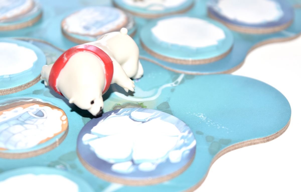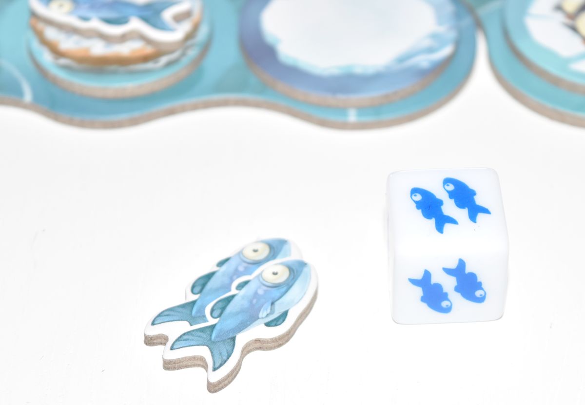 – Déclencher l’effet de la tuile : Dès qu’un ours termine son déplacement, on applique l’effet de la tuile. Certaines tuiles sont sans effet, mais d’autres possèdent quelques avantages. Les tuiles avec les pattes d’ours vous feront obtenir une action supplémentaire (déplacement + effet) à réaliser avec le même ours. Les tuiles igloo, permettent de récupérer du poisson si elles n’ont pas déjà été fouillées : le joueur récupère le poisson frais, et lance le dé. En fonction du résultat, il récupèrera un, deux ou trois poissons supplémentaire. Mais il est aussi possible de voler deux poissons frais à son adversaire. Par contre, si l’igloo a déjà été fouillé, il n’y aura aucun effet.
