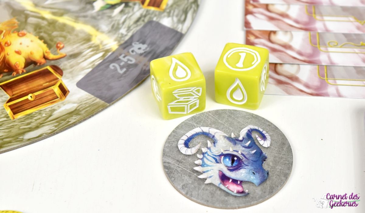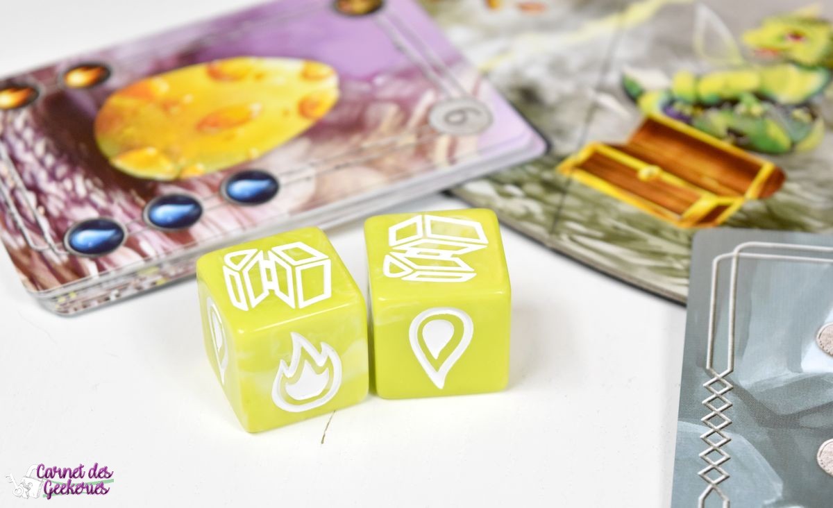 – Effectuer l’action des dés : Les dés peuvent aussi indiquer le chiffre 1 ou des ressources. Si le chiffre 1 apparaît, le joueur prend une pièce d’or. Il y en a deux ? On prend 3 pièces. Si le dé fait apparaitre une goutte, il prend une ressource pour la placer sur un de ses incubateurs. Idem ici, deux dés identiques et il en prend 3. Si un joueur ne peut pas placer certaines ressources, elles sont ajoutées dans l’un des trésors.