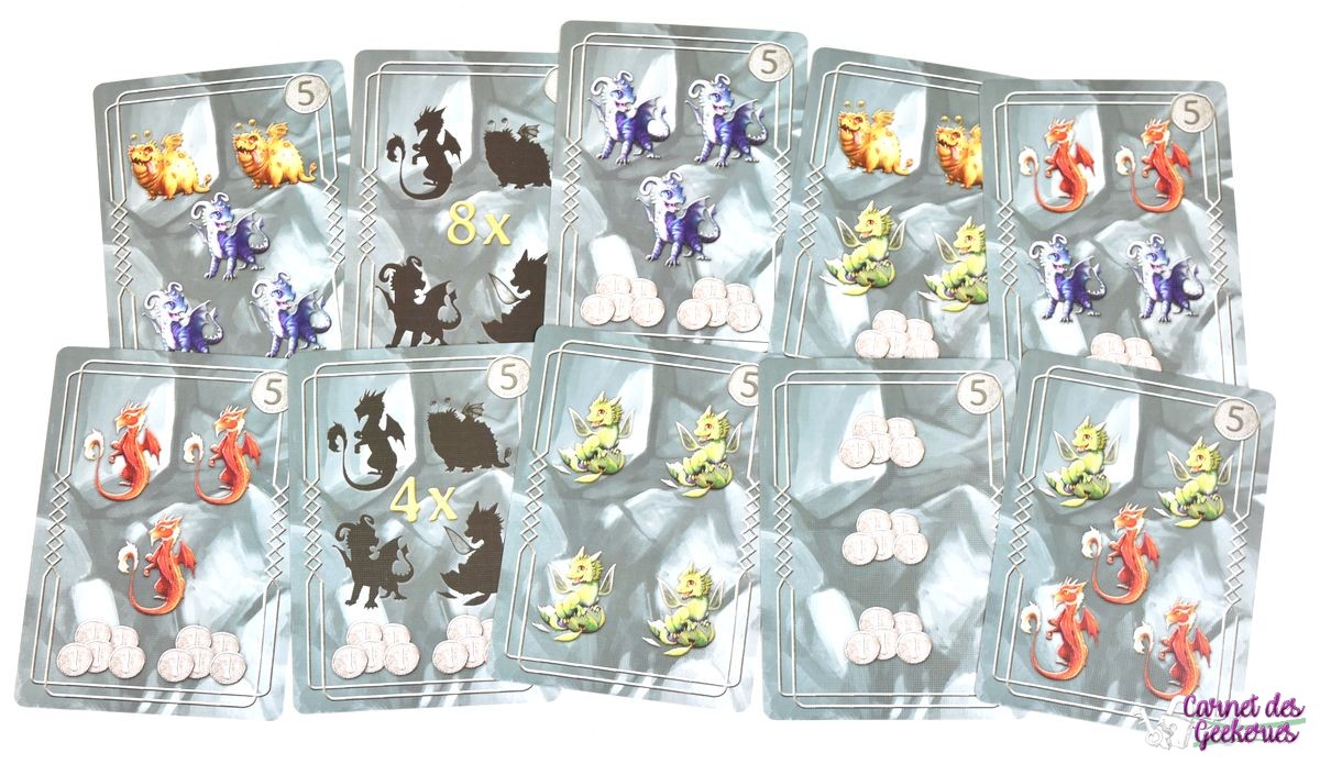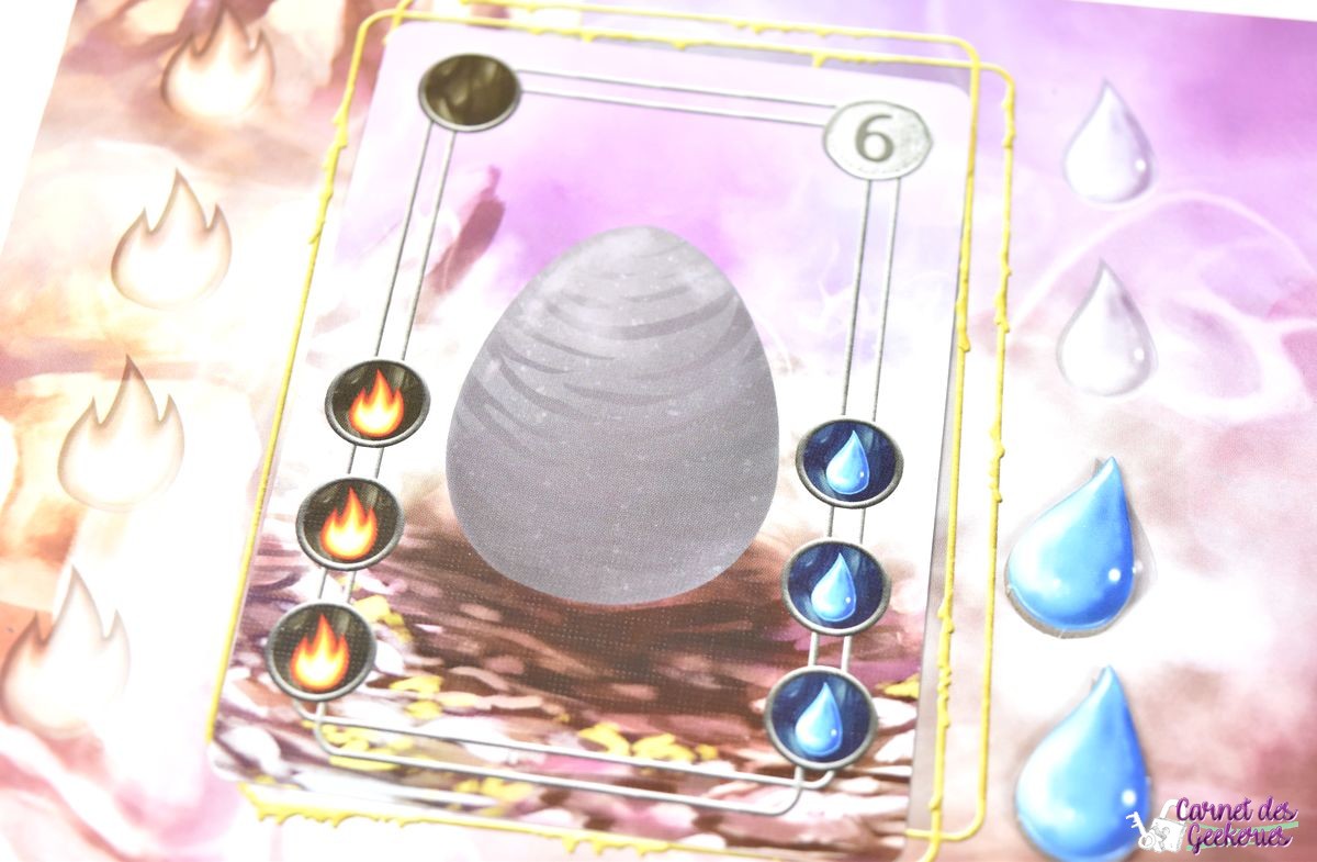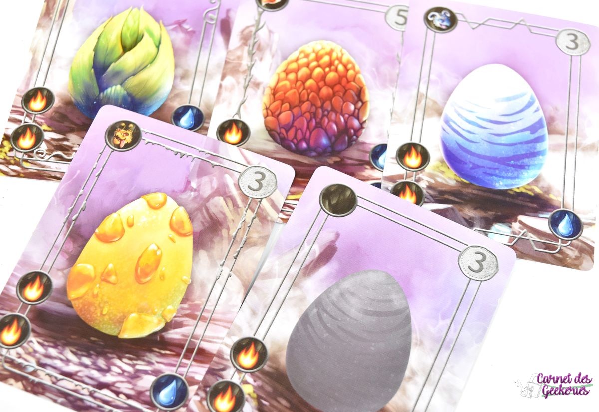 Il existe deux types d’oeufs : les oeufs hybrides, et les oeufs mystère. Dans le cas des oeufs mystères, le joueur ne prend aucun trésor mais ces cartes servent à remplacer un dragon de n’importe quelle couleur pour réaliser une carte objectif.