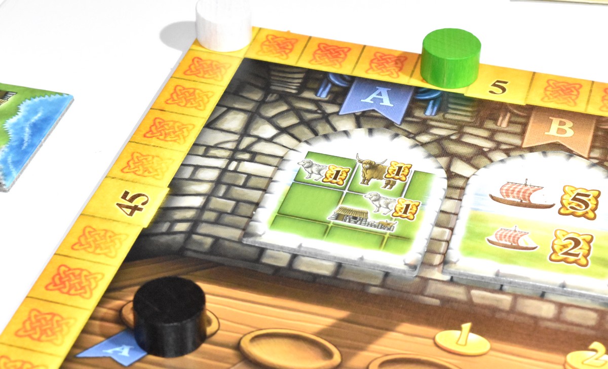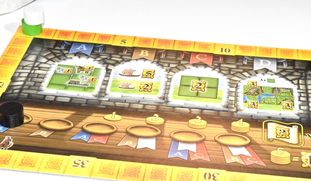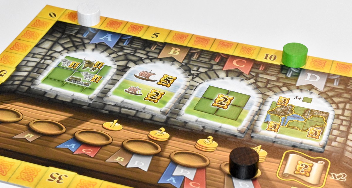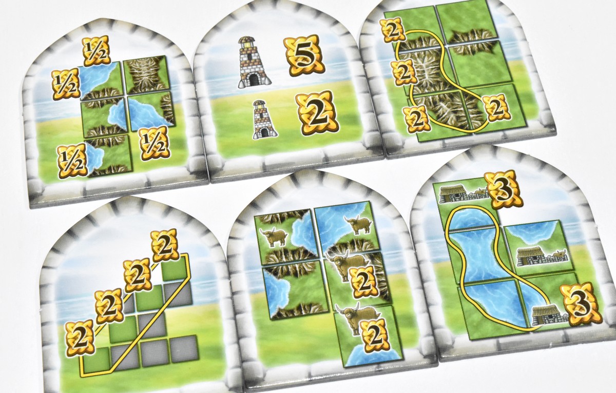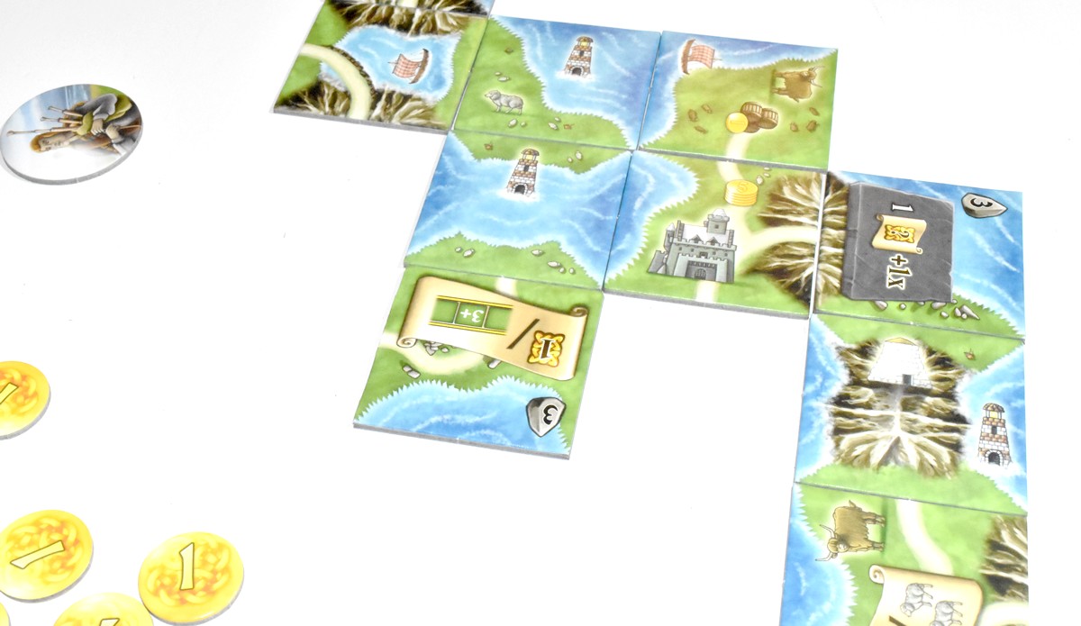 A la fin de la partie, il y a des PV à marquer pour les joueurs pour chaque tuile de leur territoire comportant un parchemin. Si ce parchemin se trouve dans une zone complétée, les points de victoire sont doublés. Et enfin chaque tranche de 5 pièces d’or rapporte un point de victoire.