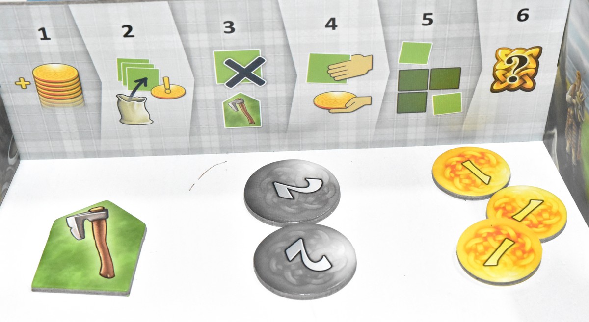 Pour la mise en place, chaque joueur récupère un paravent et la tuile château correspondante. Son château de départ lui donne accès à 5 pièces d’or, et il prend également une tuile hache qui lui permettra de défausser ses cartes par la suite. La piste de score est placée au centre de la table, avec les pions des joueurs sur la case 0 et le jeton compte tours sur le 1er tour. Toutes les tuiles sont mises dans le sac, et c’est parti !