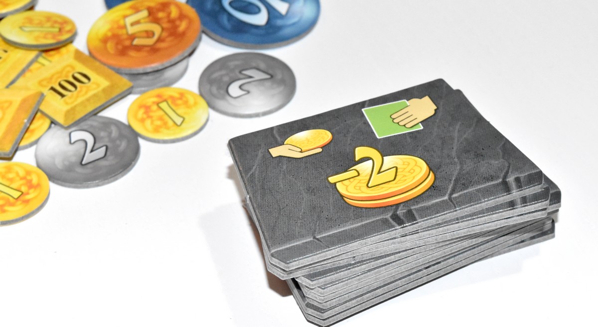 A son tour, un joueur pourra maintenant effectuer deux phases d’achats. La première, comme d’habitude, en achetant une tuile à l’un des adversaires. Mais pour la 2ème, vous aurez le choix entre acheter une tuile directement dans le sac (contre 5 pièces d’or) ou en choisir une sur le plateau Dolmen, en payant son prix. Comme à chaque nouvelle tuile récupérée, les autres se décalent vers la droite, le prix de chacune finira par baisser un peu.