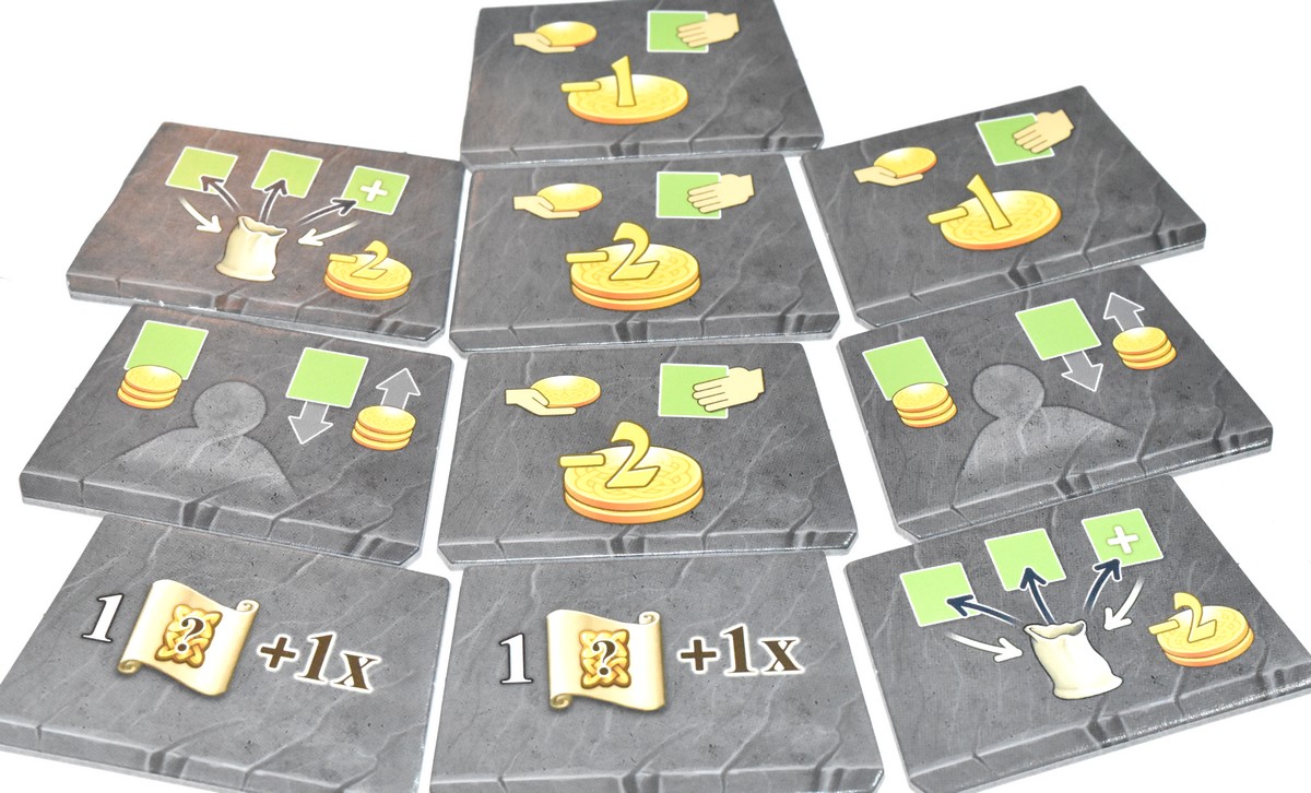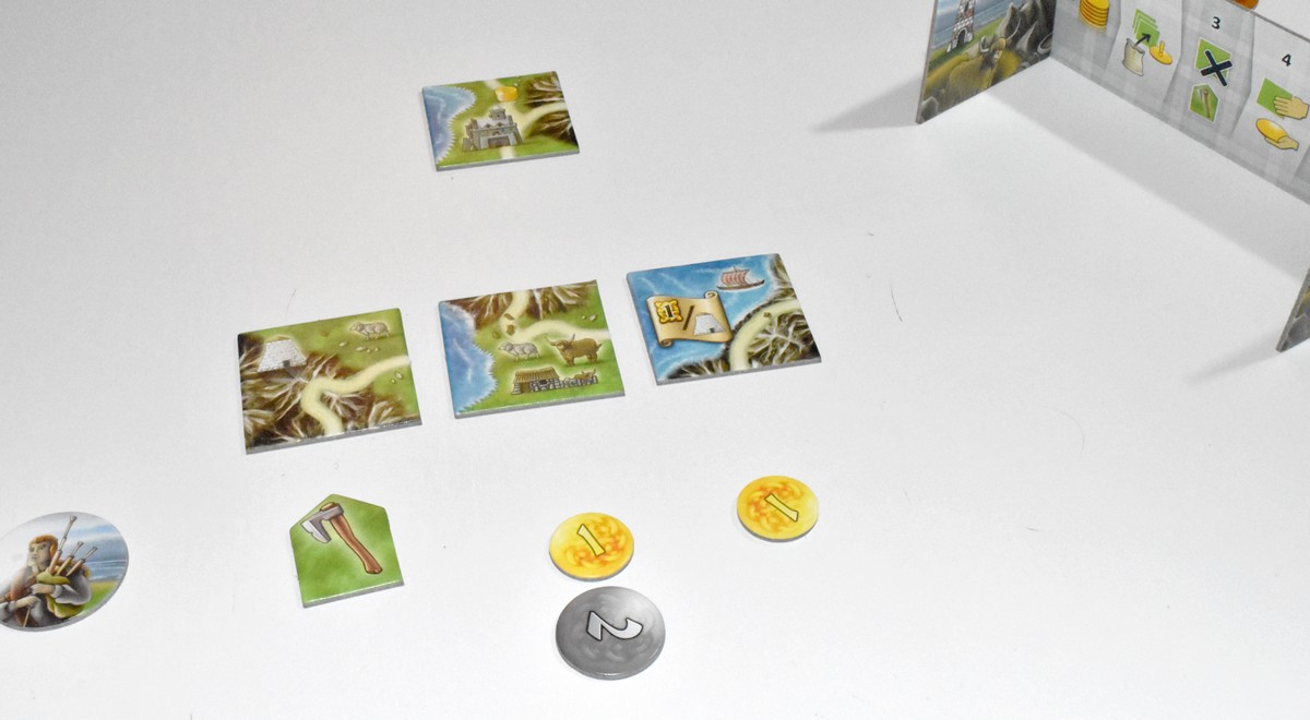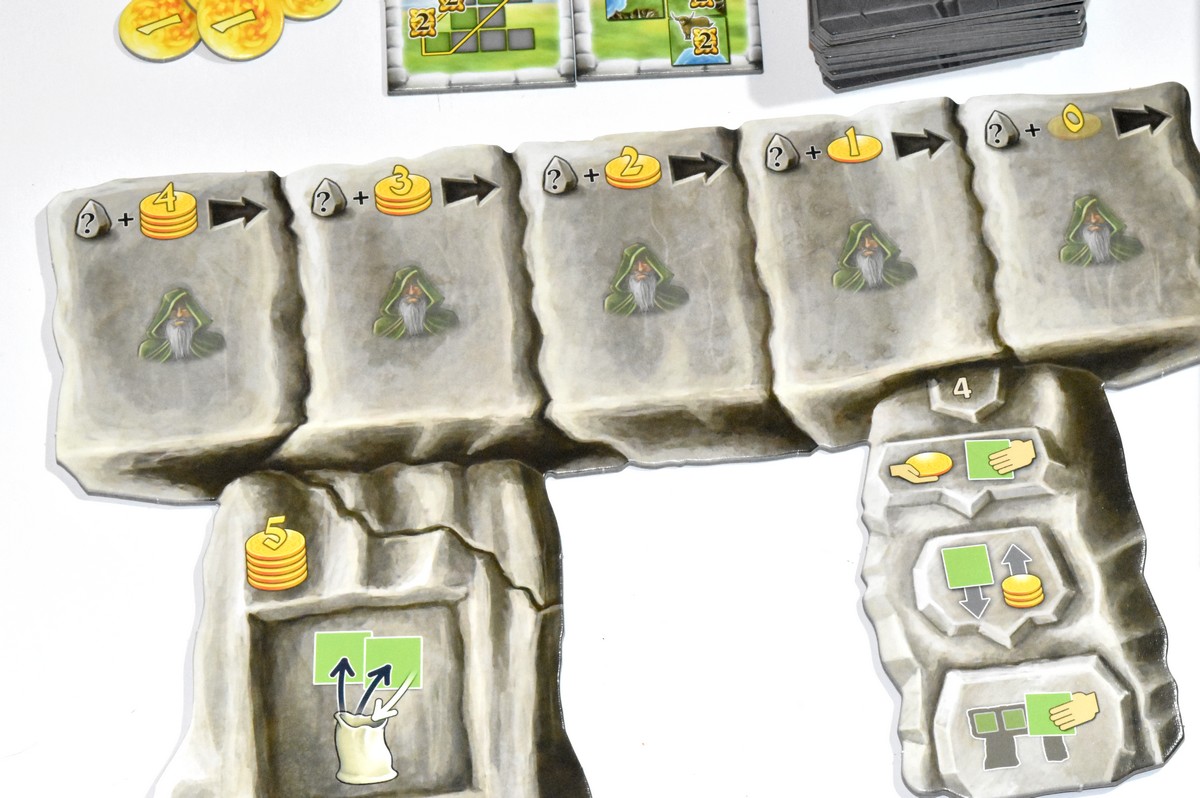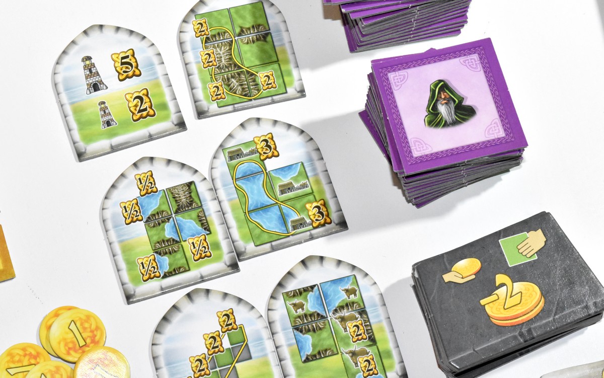 L’extension Druides rajoute des tuiles d’objectifs, et quelques pièces de monnaie en plus. On retrouve également des jetons pour marquer le score à 50 et 100 points. Mais ce qui nous intéresse le plus ici, ce sont les nouvelles tuiles Druides et le plateau Dolmen.