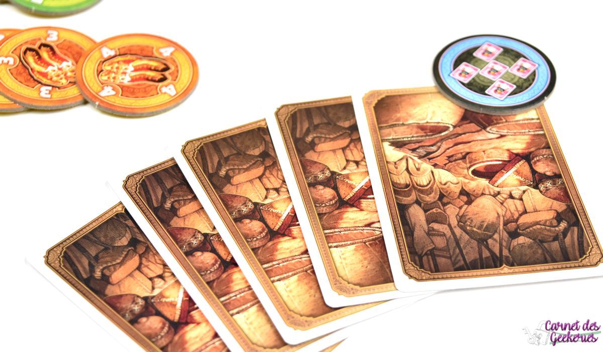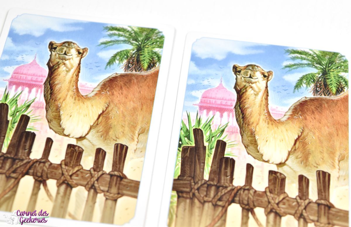 – Prendre des cartes : pour cette action, le joueur aura 3 possibilités. Il pourra choisir une seule carte marchandise parmi celles visibles sur la table, et la remplacer par une nouvelle provenant de la pioche. Il pourra également troquer ses marchandises, en échangeant un même nombre de carte de sa main (chameaux ou marchandises) contre le même nombre de cartes disponibles sur le marché. Sinon, il choisira de récupérer tous les chameaux disponibles. Il les placera dans son enclos, et les remplacera par des nouvelles cartes de la pioche. Attention, un joueur ne pourra avoir que 7 cartes maximum en main. Et petite précision supplémentaire, il n’est pas possible de prendre des chameaux et des marchandises en même temps sur le marché, et un troc est toujours constitué de minimum deux cartes.