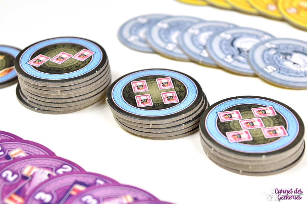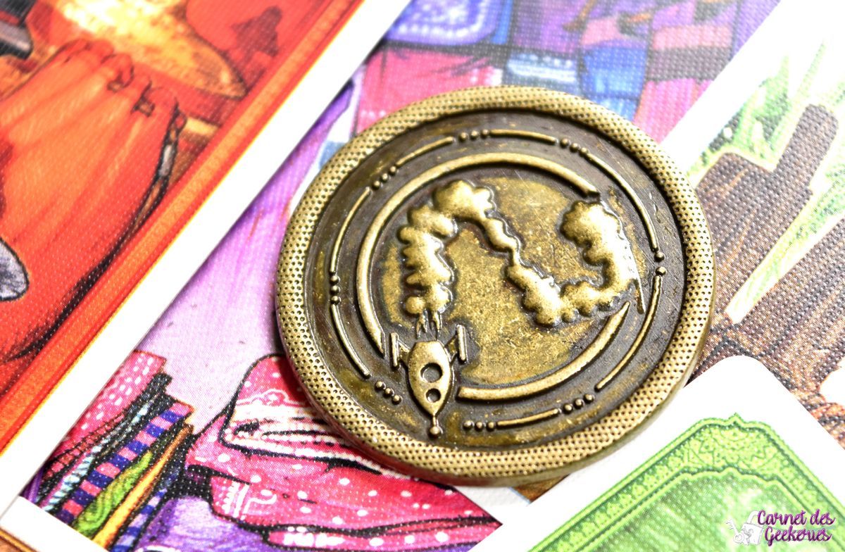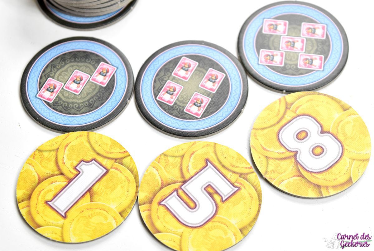 Côté réédition, je préfère nettement la version proposée par Vincent Dutrait, mais sûrement parce que j’adore son travail ! Le matériel est de bonne qualité, et bien suffisant pour un jeu de ce genre. Mention spéciale au jeton en métal qui fait le petit truc en plus non négligeable. Grâce à sa petite taille, on va facilement pouvoir l’emmener en vacances et ça c’est vraiment chouette !