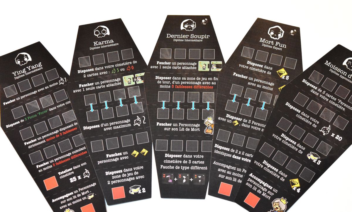 Les objectifs à atteindre donnent une autre dimension au jeu, parce qu’on ne va pas seulement chercher à faire mourir les personnages des autres, mais aussi et surtout à compléter des objectifs pour poser plus vite ses pions Faucheuse. L’interactivité est au centre du jeu avec ce système de draft, et on va aussi tenter d’influencer les autres joueurs dans leurs choix, de faire mourir les personnages qu’on souhaite. Bref, interaction bien bien présente, même à deux joueurs. Même si dans cette configuration, c’est plutôt une envie de vite faire les objectifs avant l’autre.