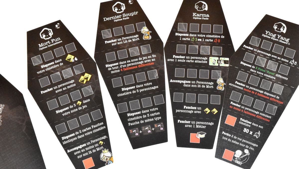 – Fauche : Les joueurs vont pouvoir tenter de faucher leurs adversaires. Chaque carte de fauche a ses petits pictos, avec des conditions à remplir pour faucher un personnage. Il faut qu’elles soient toutes sur le personnage pour qu’il puisse être fauché ! Si c’est possible, il faut placer un jeton petite mort sur la carte fauche, pour identifier le joueur à l’origine de la fauche !