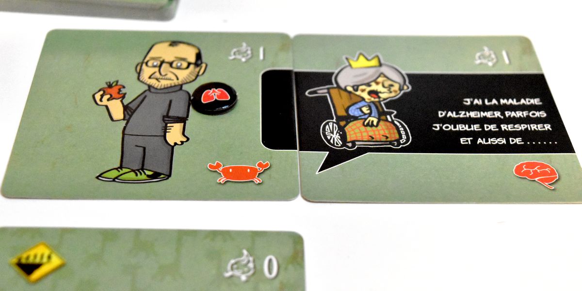 – Événements de la vie : Chaque joueur conserve une carte Caractère, et donne les deux restantes à ses voisins de gauche et droite. Avec de nouveau 3 cartes en main, les joueurs devront en poser deux et les attacher à leurs personnages, soit au même, soit à des différents. Mais attention, un personnage ne peut pas avoir plus de 3 cartes attachées. Ces cartes vont faire vieillir votre personnage et lui donner une faiblesse (cardiaque, accident, suicide, cancer, avc … joyeux hein 😉 ). A savoir que les pictos verts annulent les pictos rouge ! Histoire de rester vivant un peu plus longtemps 😉 Parce qu’au 3ème age et donc la 3ème carte rattachée, le personnage est plus proche de son lit de mort qu’autre chose 😉