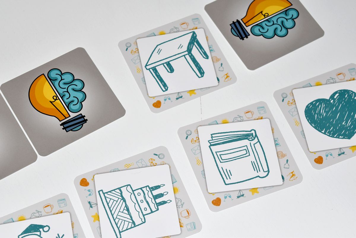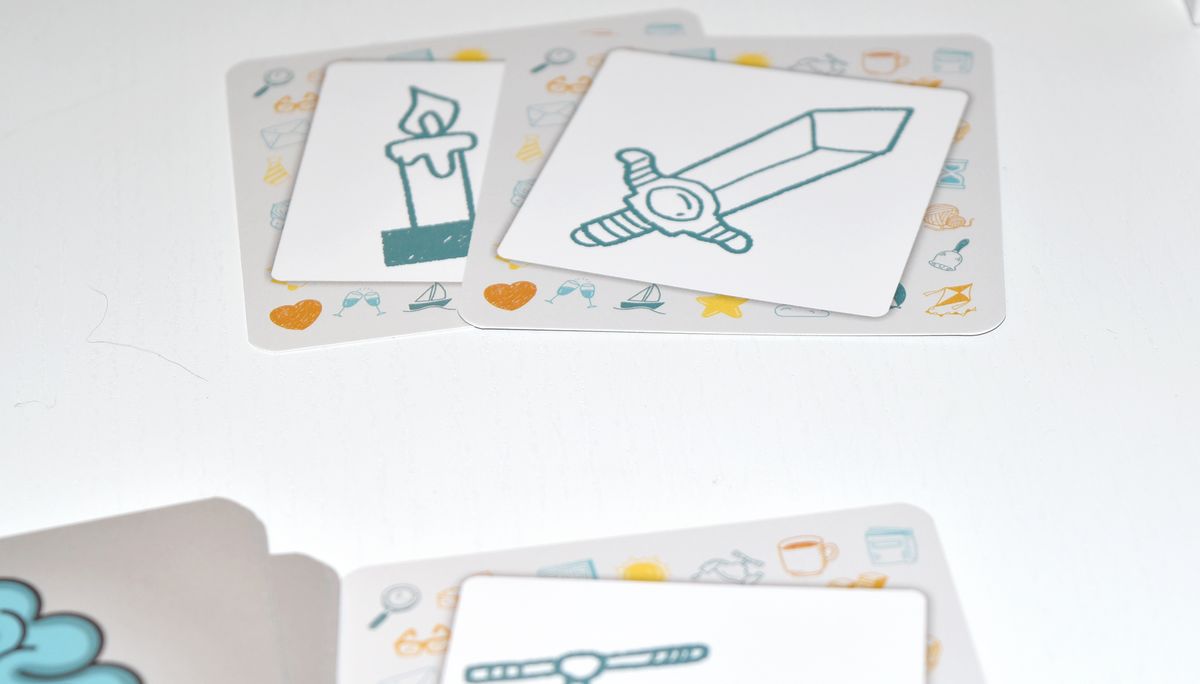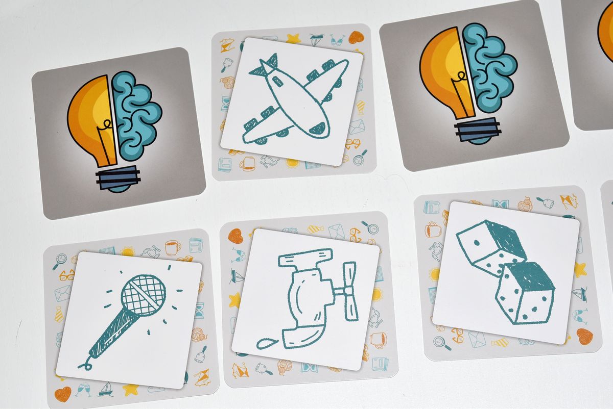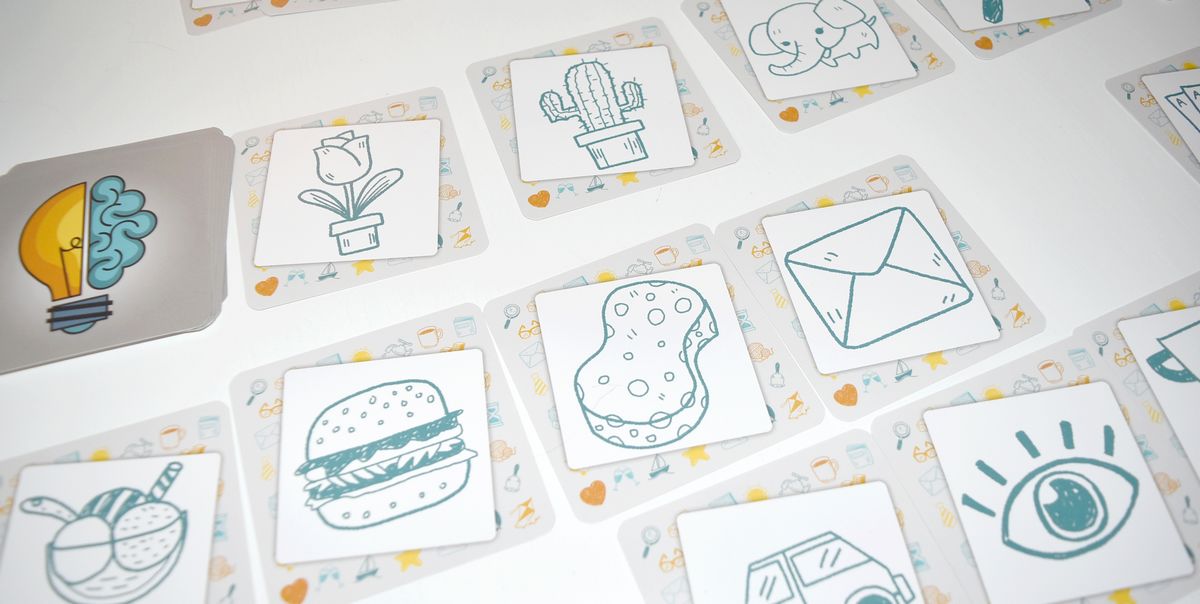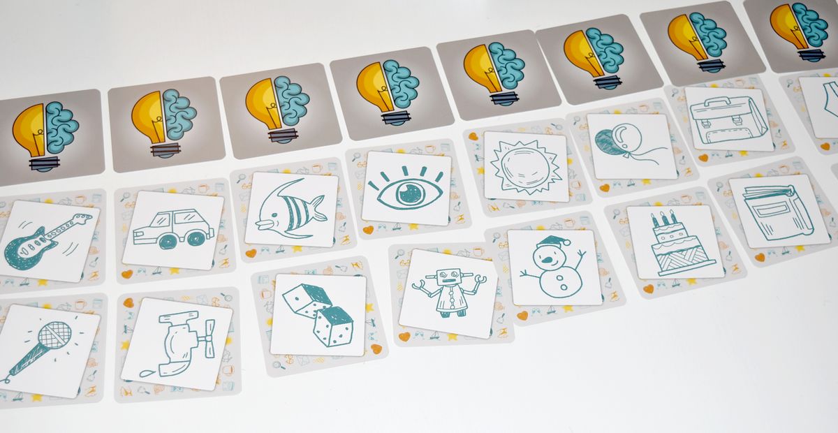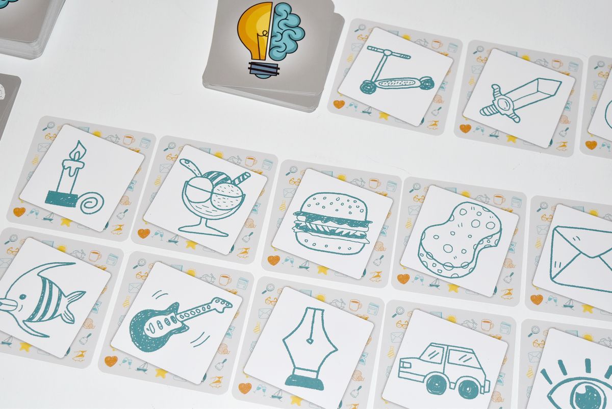 On a là un jeu coopératif d’association d’idées. Ici, pour la mise en place, il faudra mélanger les 92 cartes, et faire deux piles de 20 Cartes. L’une concernera les images idées, et la deuxième les images indices. Le reste des images est mis de côté face cachée. La pile idées sera placée au centre de la table, et on retournera face visible à droit les 4 premières cartes. Puis on étalera les 20 cartes indices sur la table. Les cartes chiffres seront placées à côté face cachée.