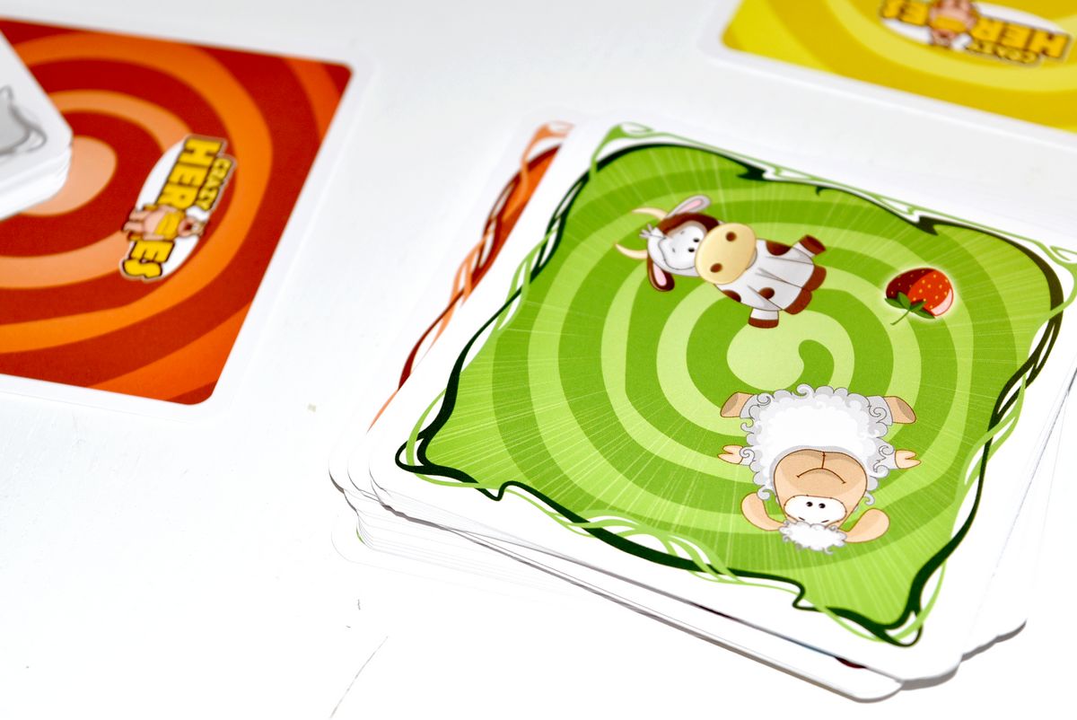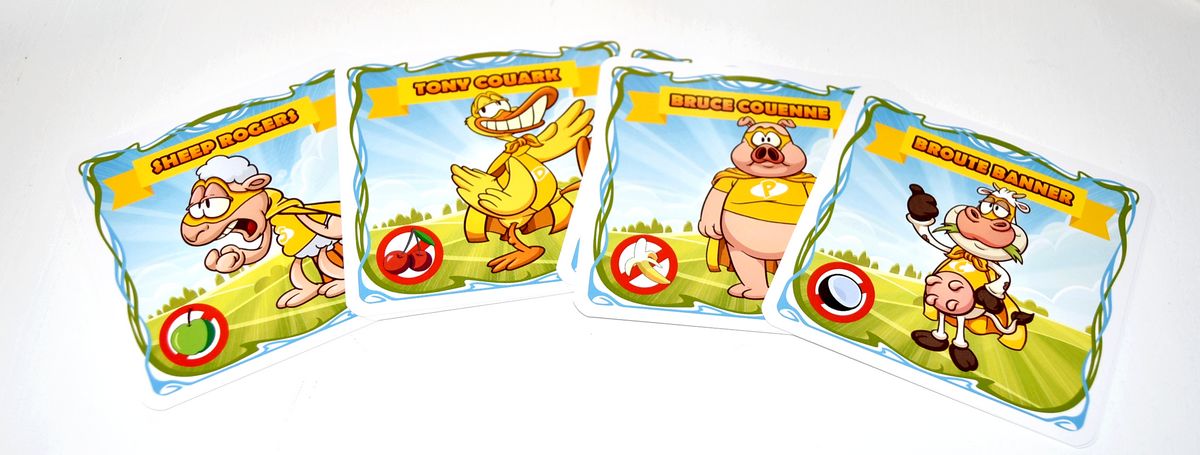 Mais forcément il y a des petites contraintes ! Chaque héro à son point faible et est allergique à un fruit. Il n’est donc pas possible de prendre la carte si elle comporte ce fruit auquel vous êtes allergique. Si une carte changement de cri arrive, il faut retirer la première carte cris sur chacune des 4 piles. Si un joueur se trompe et ne prend pas la bonne carte ou ne fait pas le bon cri, il devra retirer une carte de sa pile de points.