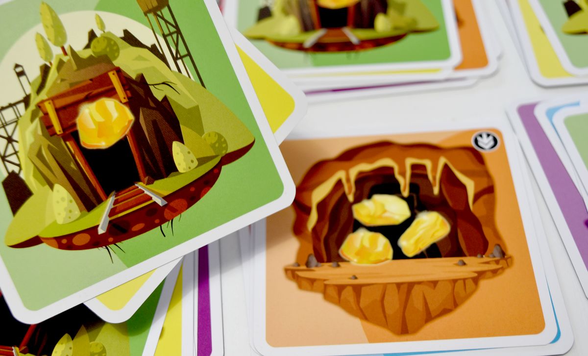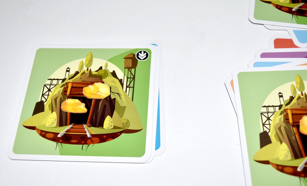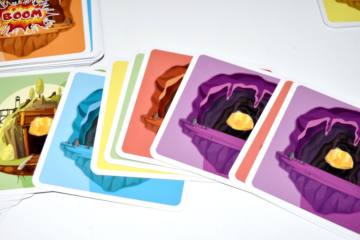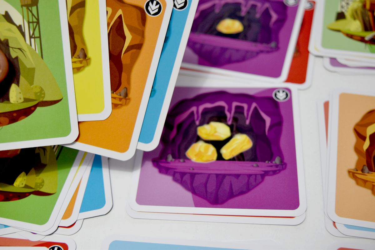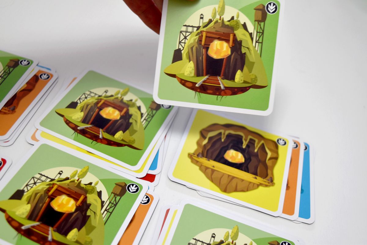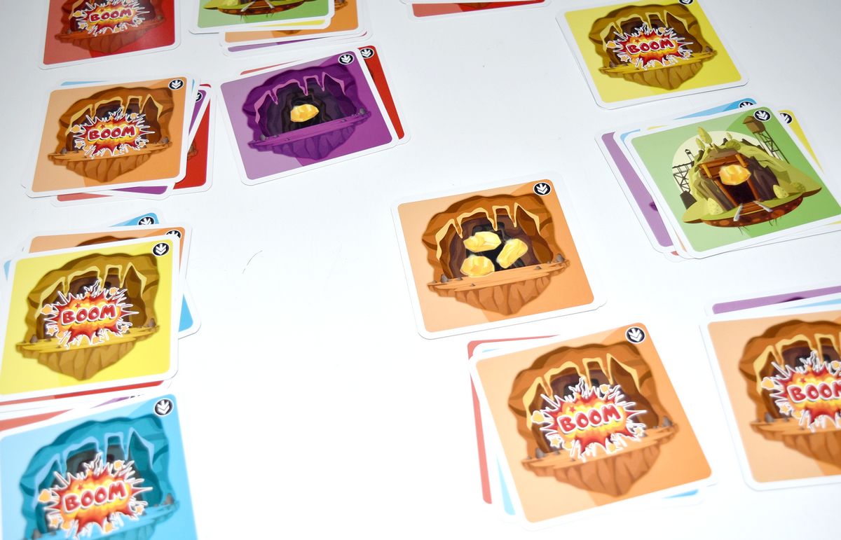 A son tour, le joueur choisit une mine ouverte pour tenter de ramasser des pépites. Et là c’est un stop ou encore. Le joueur prendra la 1ère carte et pourra choisir de s’arrêter ou de continuer (d’où l’importance de mémoriser dès le début lors de la construction des mines). Mais s’il décide de continuer, il ne pourra le faire que dans la pile choisie au début. Il ne pourra pas changer de mine en cours de route.