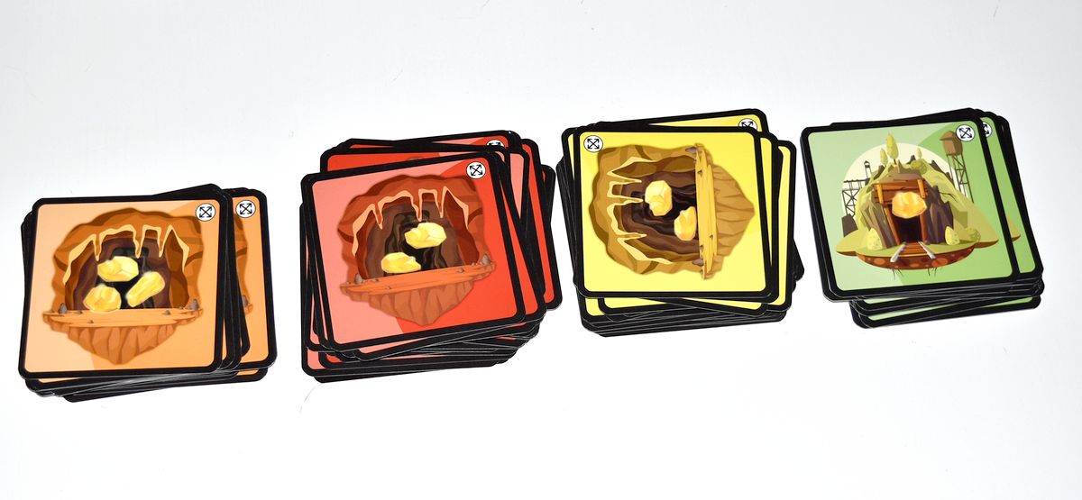 Les 16 piles représentent des mines d’or qui peuvent être soit ouvertes (avec pépite d’or), soit explosée (boom), ou épuisée (si elle est vide). Au début de la partie toutes les mines sont ouvertes.