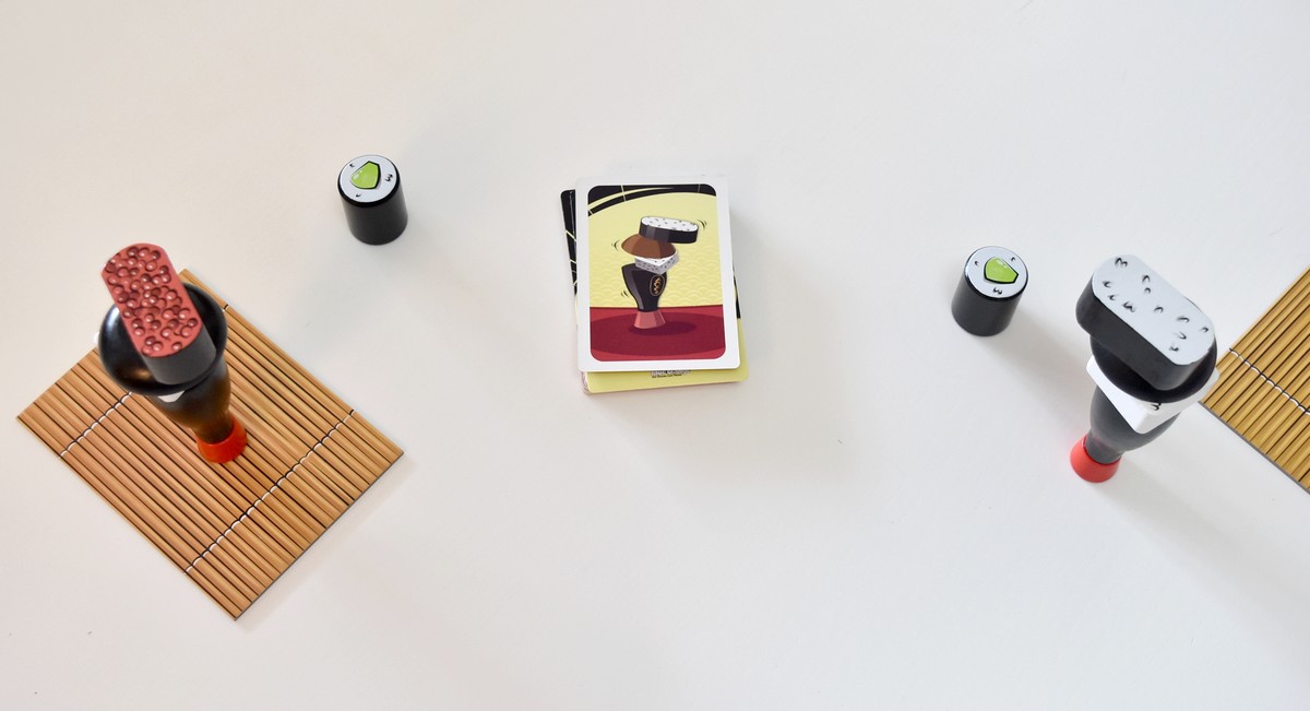 Avant de commencer, l’un des joueurs fait un décompte et retourne la 1ère carte de la pioche pour découvrir l’empilement à réaliser. Les deux équipes jouent en simultané, et doivent réussir leur pile de sushis le plus vite possible ! Mais attention, il va falloir bien regarder le sens, tout bien observer parce qu’il peut y avoir quelques pièges…