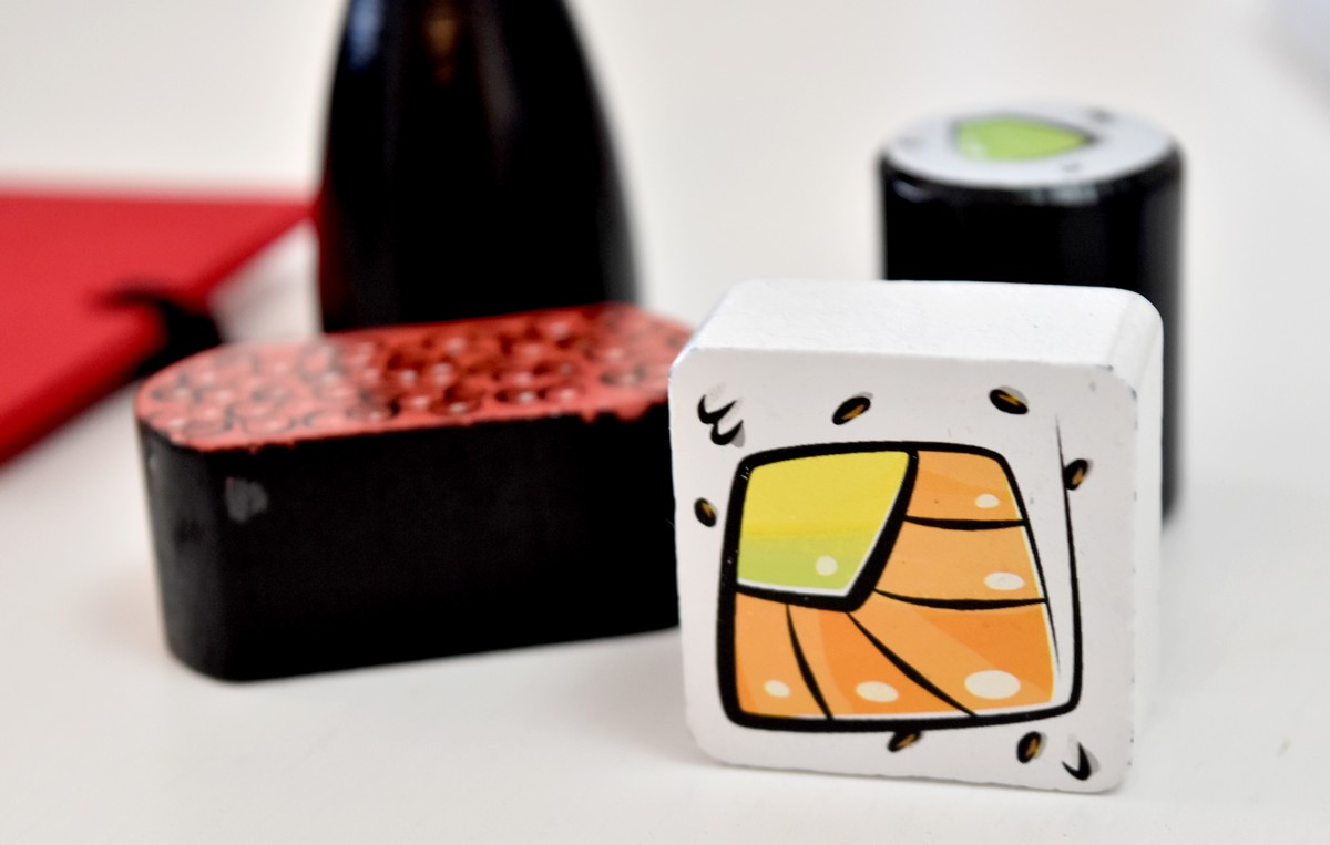 – Carte rouge « Yeux bandés » : Chaque équipe choisit le joueur qui devra porter le masque pour assembler les sushis, et l’autre joueur devra le guider. Dans une partie à 3 joueurs, deux d’entre eux décrivent la carte à celui qui a les yeux bandés.