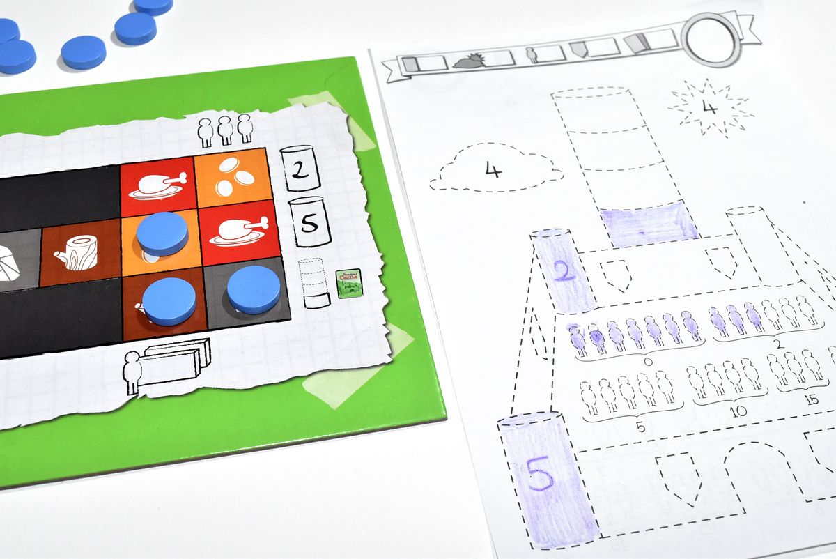 Pour construire une partie de son château, on regardera donc la caractéristique qui s’y rapporte (entre le mur, les étages du donjon, les tours, les drapeaux …). On la dessinera sur son château en indiquant les points à l’intérieur pour les tours notamment 🙂 Le premier joueur à réaliser les 4 tours, aura le droit de colorier son soleil et marquer quelques points supplémentaires. Mais il n’y a pas que ça à construire dans votre château :