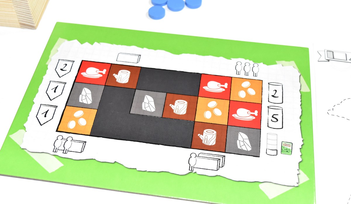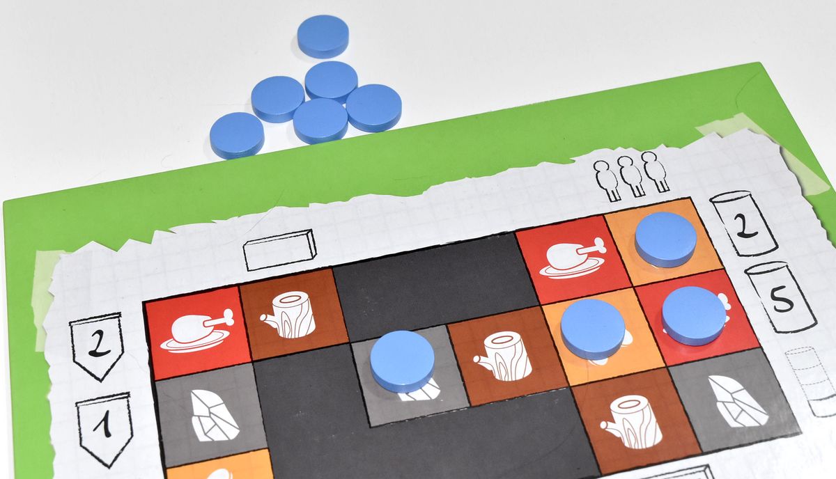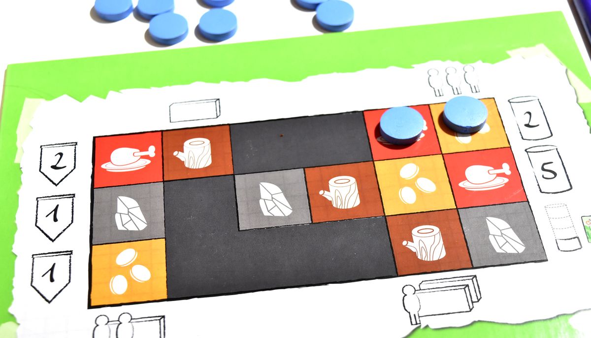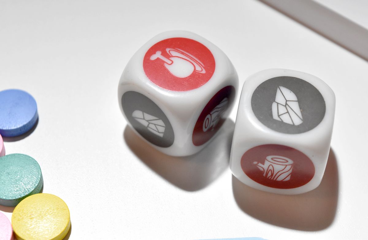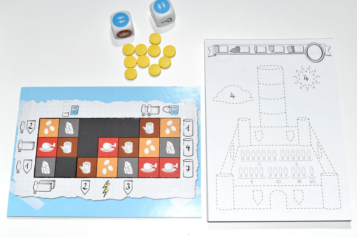 Le 1er joueur lance les deux dés. En fonction du résultat de la matière première, un jeton sera posé sur une case bois, or, pierre ou nourriture. Si c’est une face habitants qui apparait, il coloriera 2 habitants sur sa feuille, qui selon leurs groupes, rapporteront des points en fin de partie ! Et si c’est un ? il choisira la face de dés qu’il désire activer.