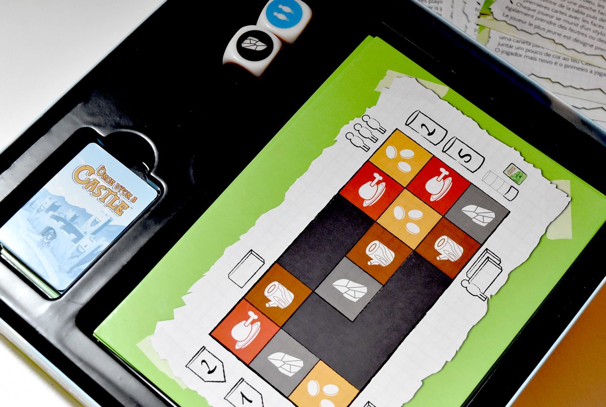 Côté matériel, c’est basique mais efficace ! Un bloc de feuilles châteaux (avec une face déjà dessinée, et l’autre non pour laisser libre court à votre imagination), 4 plateaux et leurs pions, deux dés, quelques cartes et le tour est joué ! Les dessins proposés sur les cartes sont très enfantins mais restent totalement dans le thème du jeu, et ça fonctionne très bien ! Après si j’ai juste un petit bémol à faire, ce serait le manque de crayons ! Parce que oui, c’est bête mais quand j’embarque des jeux en soirée ou autres, je ne pense pas forcément aux crayons ! Alors à terme, je mettrais 4 petits crayons à l’intérieur de la boîte pour ne pas me faire avoir !