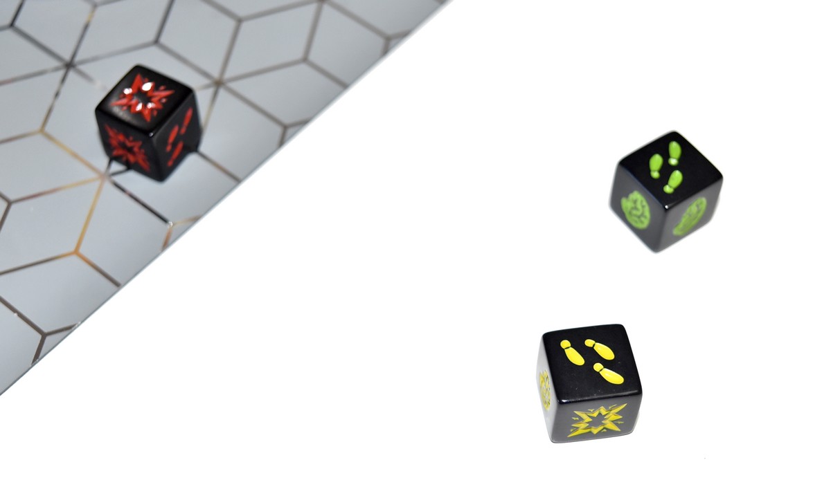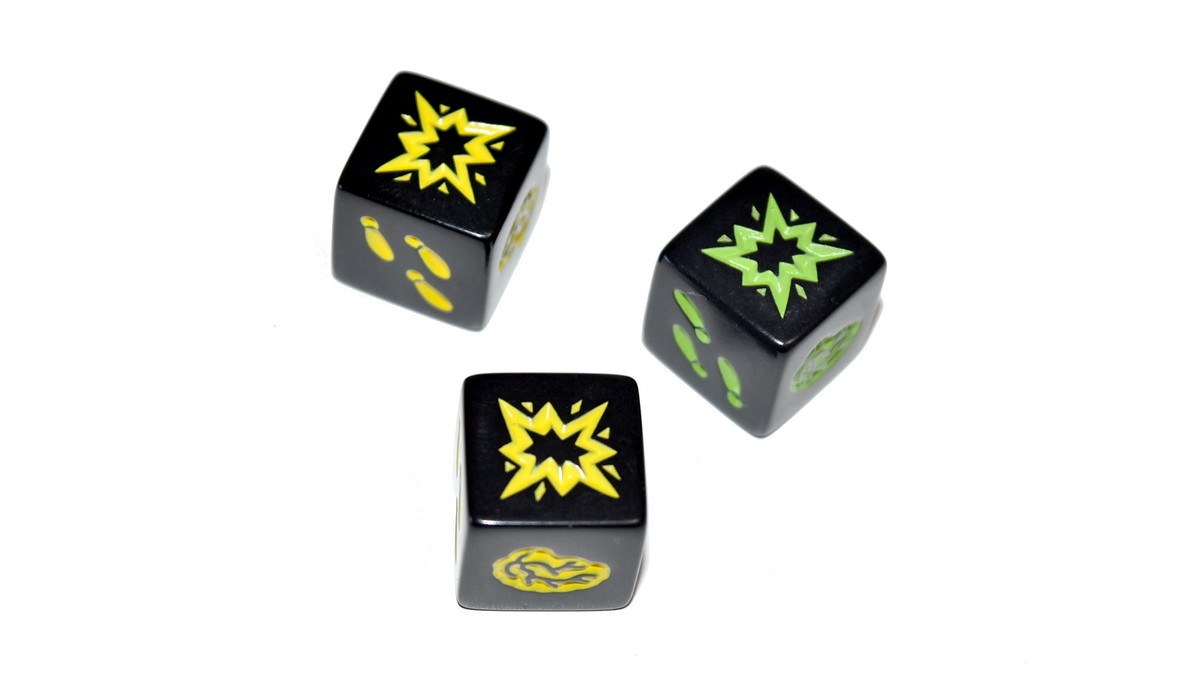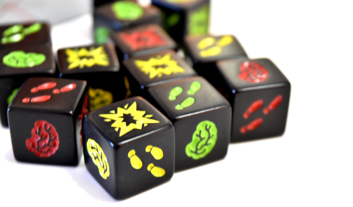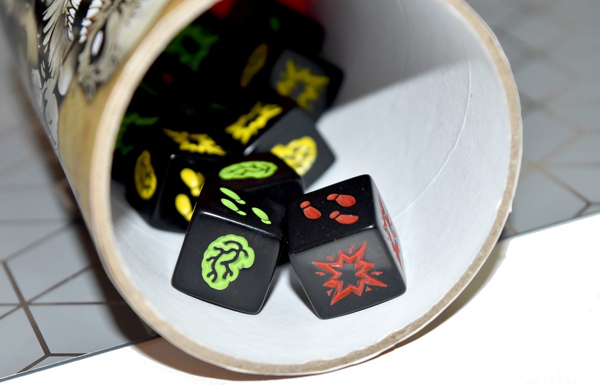 Lors de son tour, le joueur va secouer le gobelet, et récupérer 3 dés à l’intérieur au hasard. Plus qu’à les lancer & à découvrir le résultat. En fonction des dés, vous les mettrez de côté ou vous les rejouerez. Les cerveaux et les fusils seront placés à votre gauche ou à votre droite. Vous pouvez rejouer autant de fois que vous le voulez, mais il faut toujours lancer 3 dés. Si vous décidez de rejouer, vous gardez vos dés empreintes en main et vous y rajoutez un ou plusieurs dés, ou aucun, jusqu’à avoir 3 dés en main. Une fois la décision prise, vous ne pouvez pas revenir en arrière, et vous serez obligés de lancer vos dés. Attention à ne pas être trop gourmand …